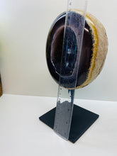High quality large Natural Agate Geode with sparkling crystals in the middle sitting on a black stand. This Agate is a natural stone, cut in half and then polished to reveal naturally occurring patterned rings and crystals inside.