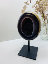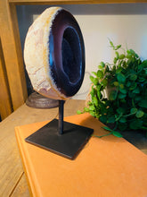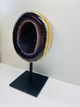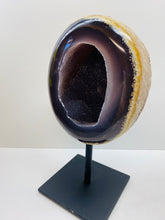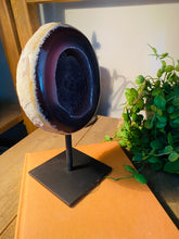 This item will perfectly compliment any living room, office or bedroom. The Agate Geodes have been hand selected to ensure nice colouring and stunning crystals in the middle. The Geode sits on top of a black stand.