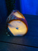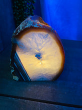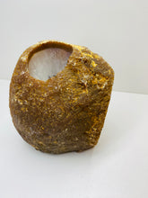 Natural Agate tea light candle holder. This Agate is a natural stone, cut in half, coloured and then polished to reveal naturally occurring patterned rings, geodes and crystals inside. The Agate has been cut to fit a tea light candle in (the depth of the hole varies slightly).