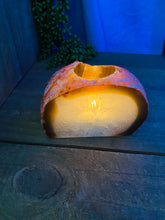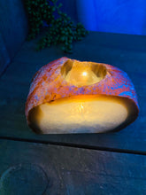 Natural Agate tea light candle holder. This Agate is a natural stone, cut in half, coloured and then polished to reveal naturally occurring patterned rings, geodes and crystals inside. The Agate has been cut to fit a tea light candle in (the depth of the hole varies slightly).