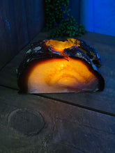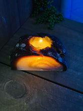 Natural Agate tea light candle holder. This Agate is a natural stone, cut in half, coloured and then polished to reveal naturally occurring patterned rings, geodes and crystals inside. The Agate has been cut to fit a tea light candle in (the depth of the hole varies slightly).