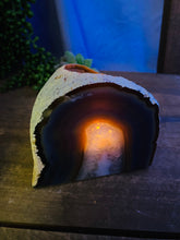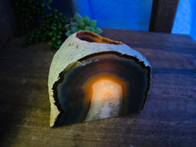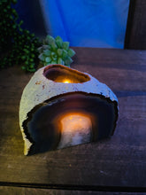 Natural Agate tea light candle holder. This Agate is a natural stone, cut in half, coloured and then polished to reveal naturally occurring patterned rings, geodes and crystals inside. The Agate has been cut to fit a tea light candle in (the depth of the hole varies slightly).