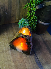 Natural Agate tea light candle holder. This Agate is a natural stone, cut in half, coloured and then polished to reveal naturally occurring patterned rings, geodes and crystals inside. The Agate has been cut to fit a tea light candle in (the depth of the hole varies slightly).