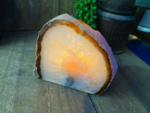 Natural Agate tea light candle holder. This Agate is a natural stone, cut in half, coloured and then polished to reveal naturally occurring patterned rings, geodes and crystals inside. The Agate has been cut to fit a tea light candle in (the depth of the hole varies slightly).