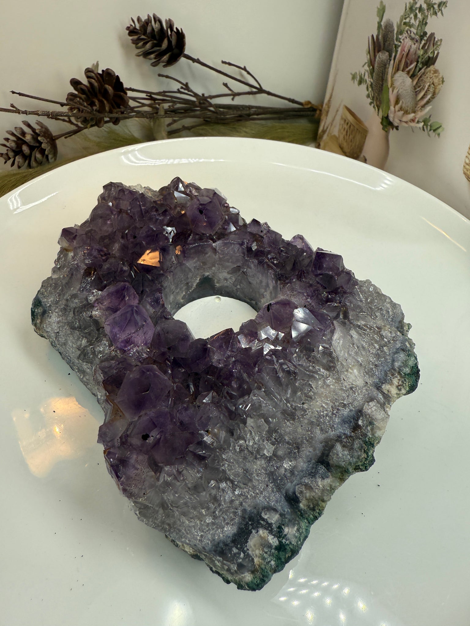 Amethyst is widely known for its ability to cleanse negative energy, promote balance, and create a peaceful atmosphere, making this piece both decorative and energetically supportive.