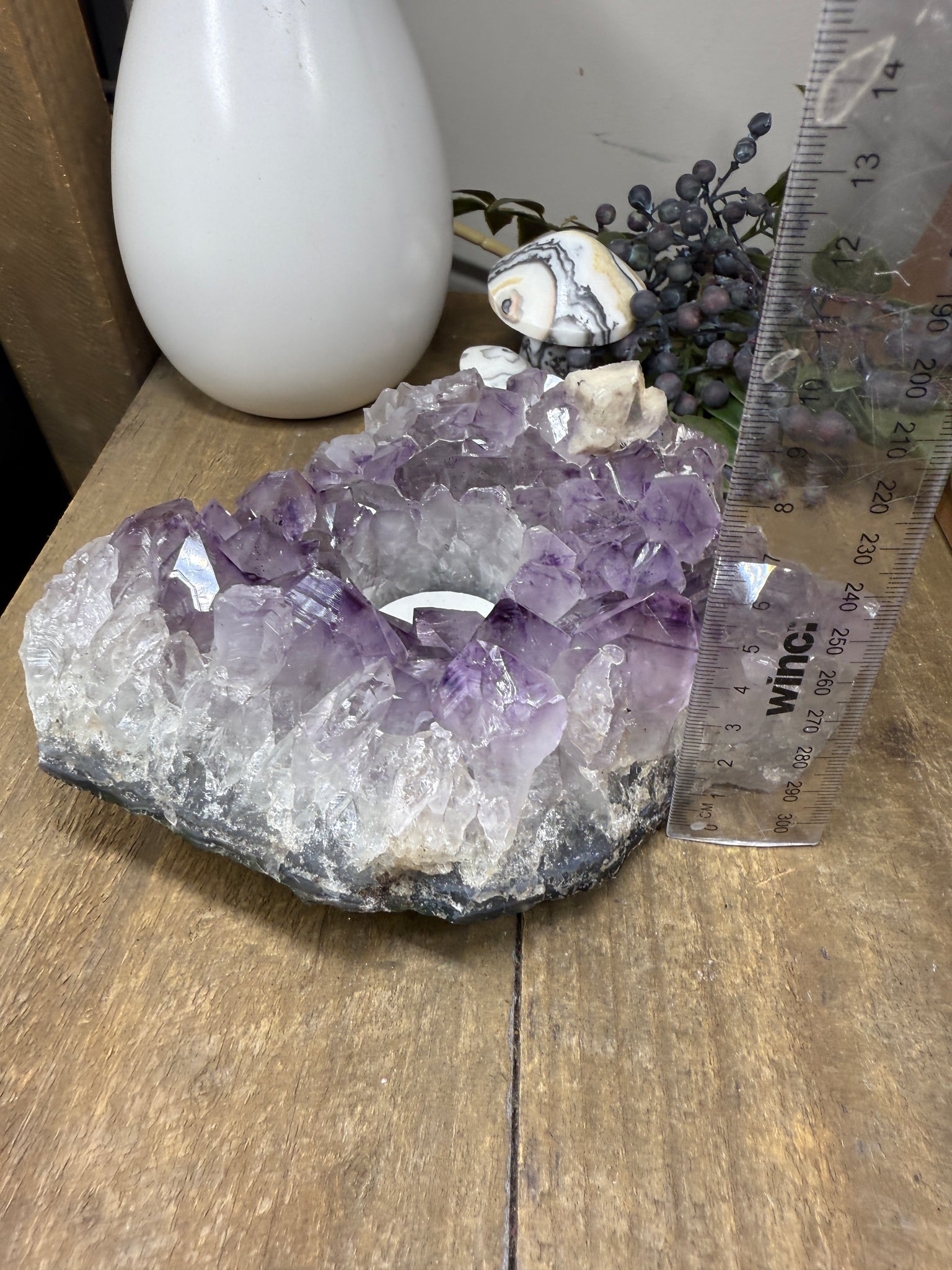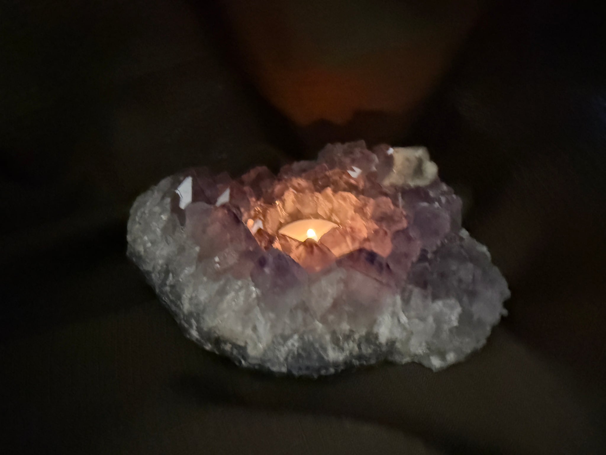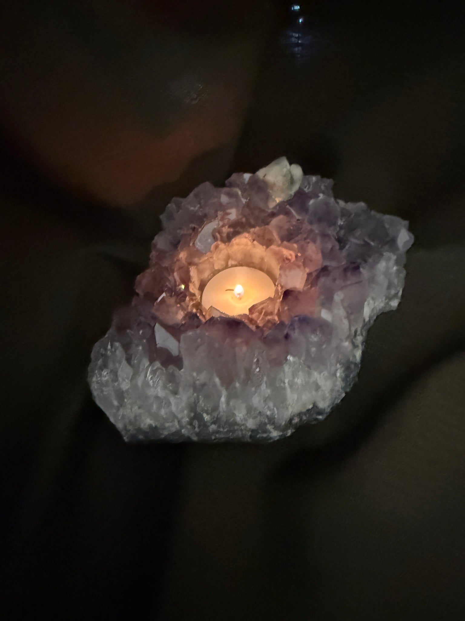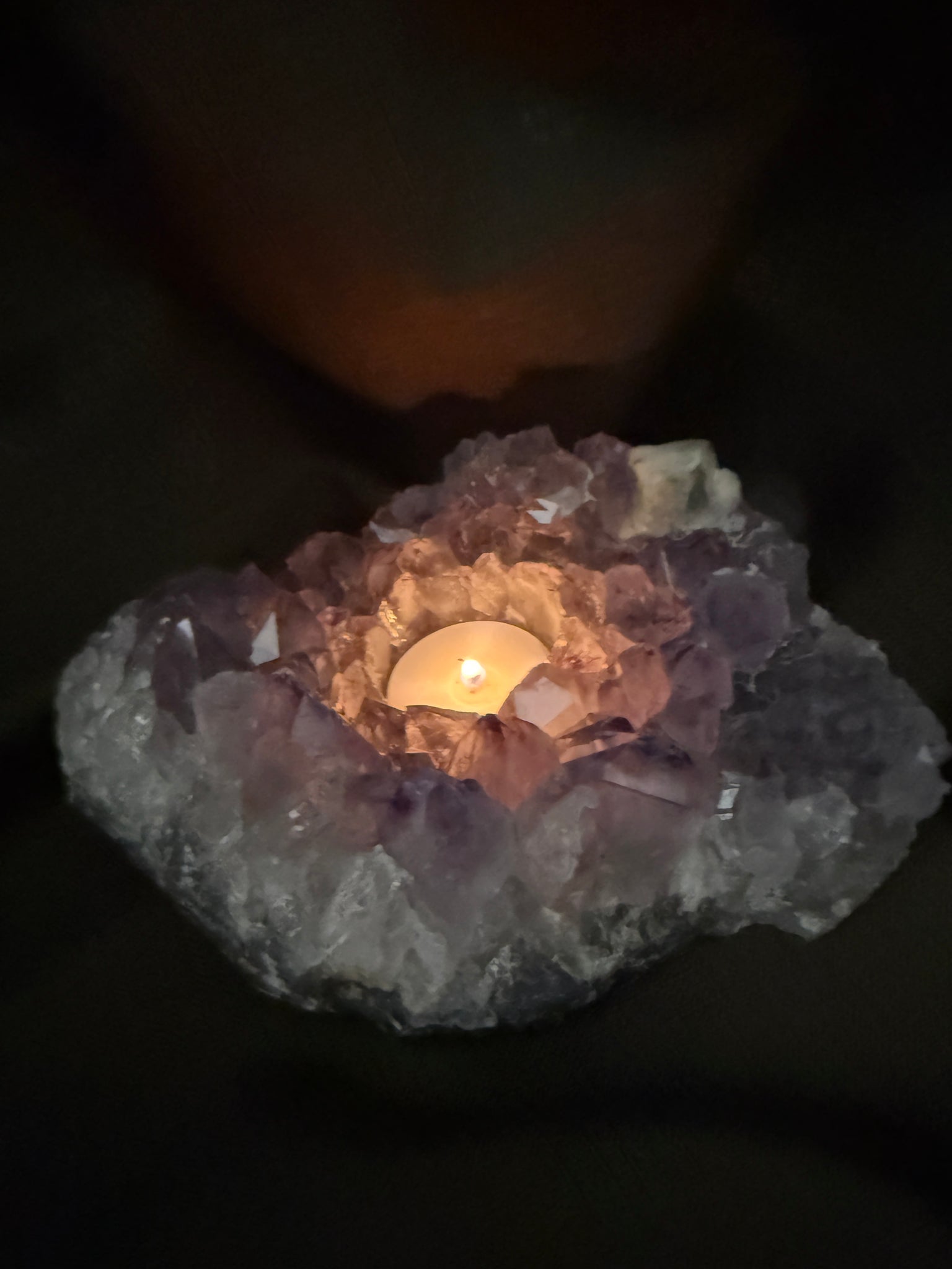 Perfect for styling in a living room, bedroom, meditation space, or as a unique crystal gift, this Amethyst candle holder adds both beauty and calming energy to your space. The listing photos show a standard tea light candle, and your purchase includes a complimentary tea light to get you started.