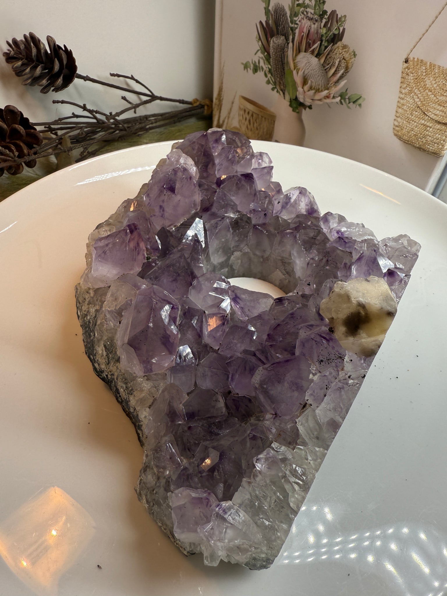 Amethyst is widely known for its ability to cleanse negative energy, promote balance, and create a peaceful atmosphere, making this piece both decorative and energetically supportive.