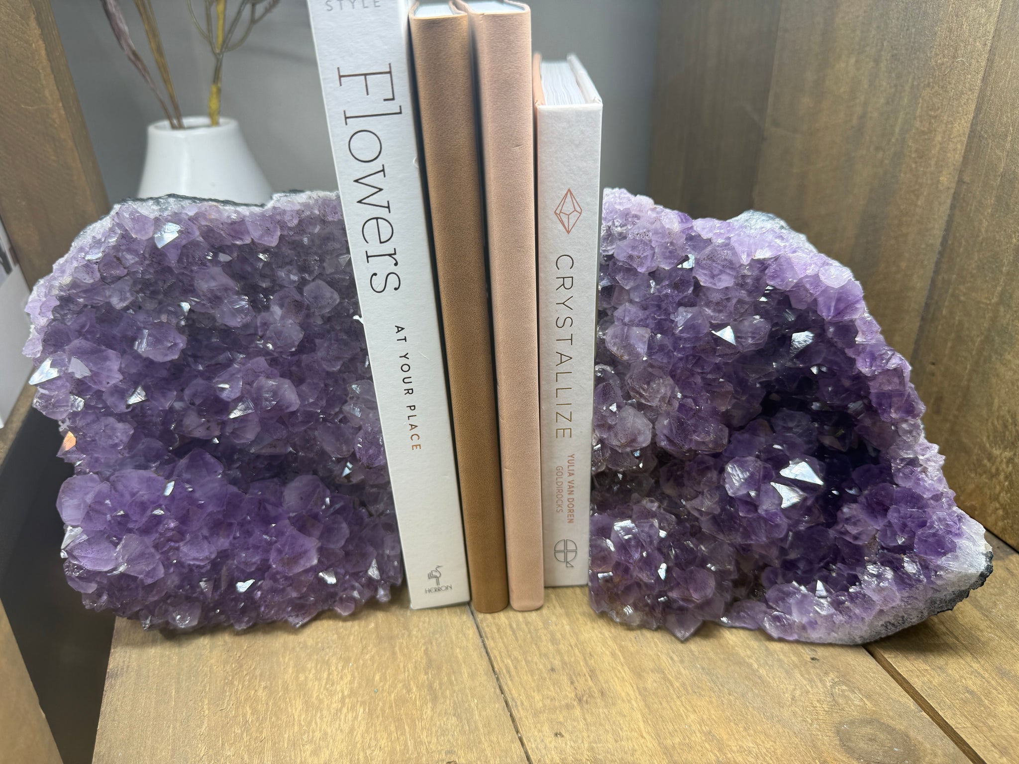 Premium Quality Amethyst Crafted from high-quality Brazilian Amethyst, these bookends are both functional and decorative. Their vibrant purple tones make them a striking addition to any living room, bedroom, or office décor, offering a unique way to display natural crystals in the home.