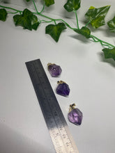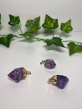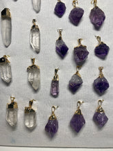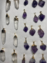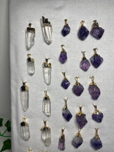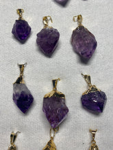 Natural Amethyst crystal point pendant with Gold Electroplating. Each pendant is a natural Amethyst point which has been carefully finished with gold electroplating and a gold clasp at the top.