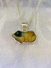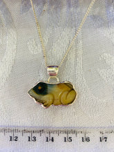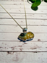 Ocean Jasper pendant set in sterling silver. This gorgeous piece of Ocean Jasper has been delicately carved into the shape of a frog and then finished with Sterling Silver around the edges.