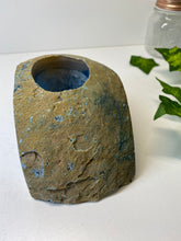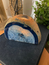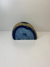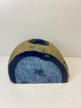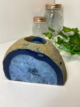 Coloured Blue Agate tea light candle holder. This Agate is a natural stone, cut in half, coloured and then polished to reveal naturally occurring patterned rings, geodes and crystals inside. The Agate has been cut to fit a tea light candle in (the depth of the hole varies slightly).
