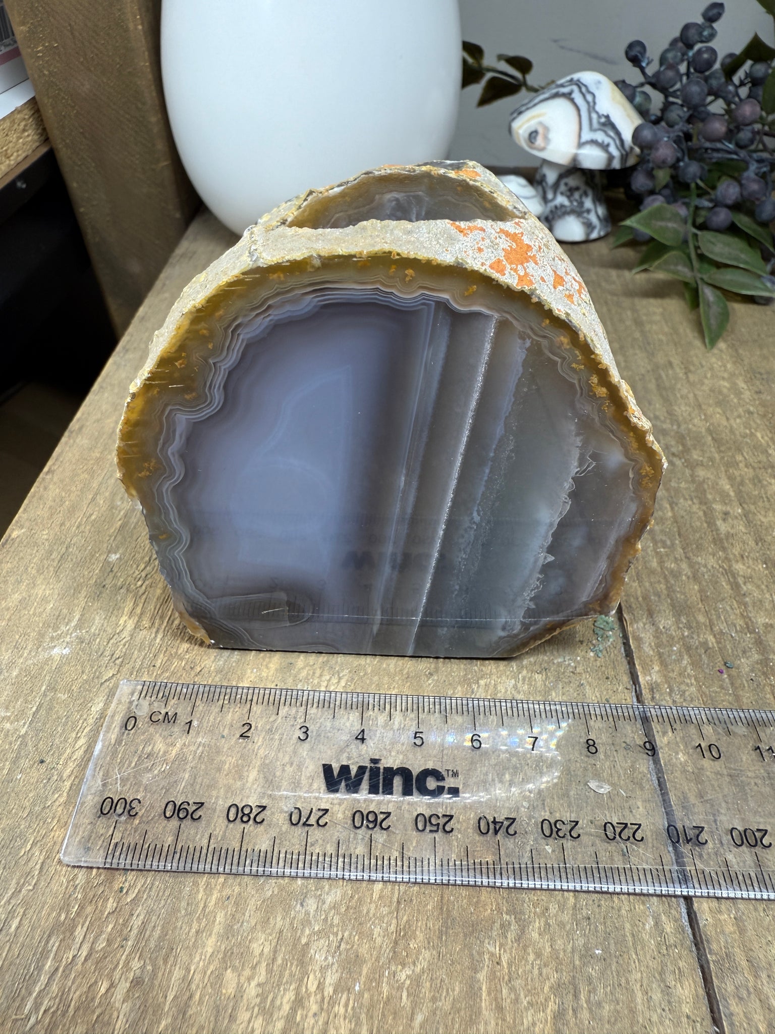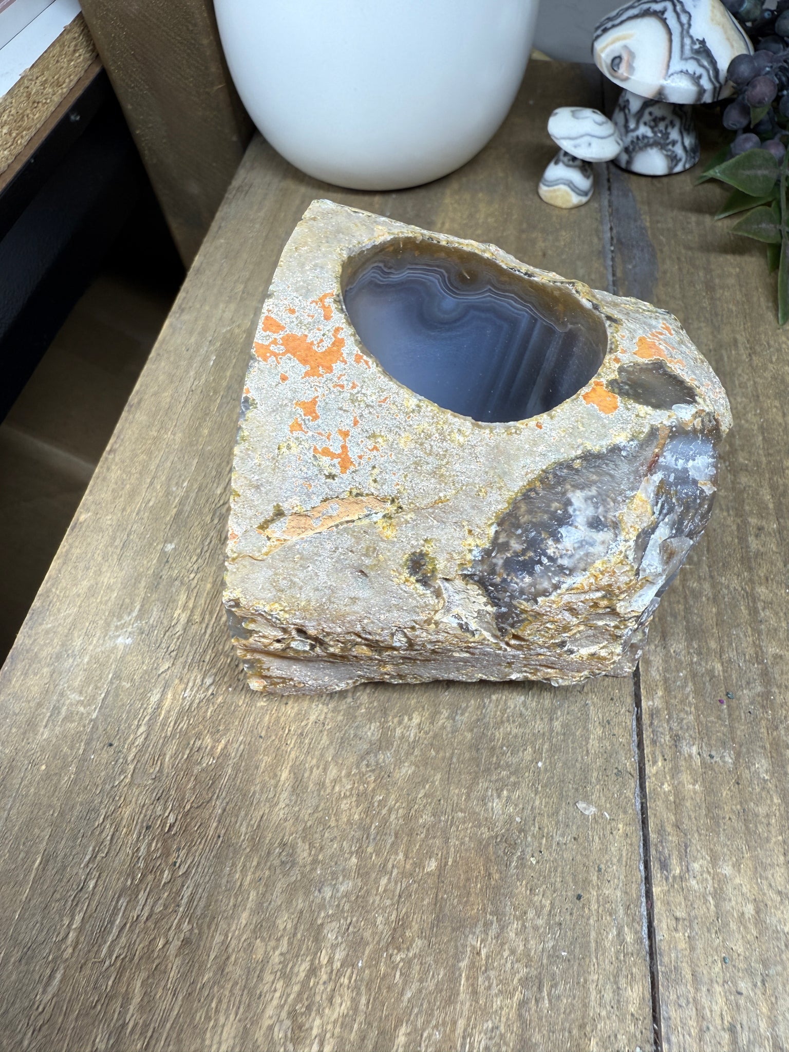 Illuminate your space with the calming energy of this Natural Agate Tea Light Candle Holder. Hand‑crafted from genuine agate stone, each piece is cut in half, and polished to reveal its naturally occurring rings, sparkling geodes, and crystal formations. Designed to hold a tea light candle, this crystal décor piece blends functionality with natural beauty.