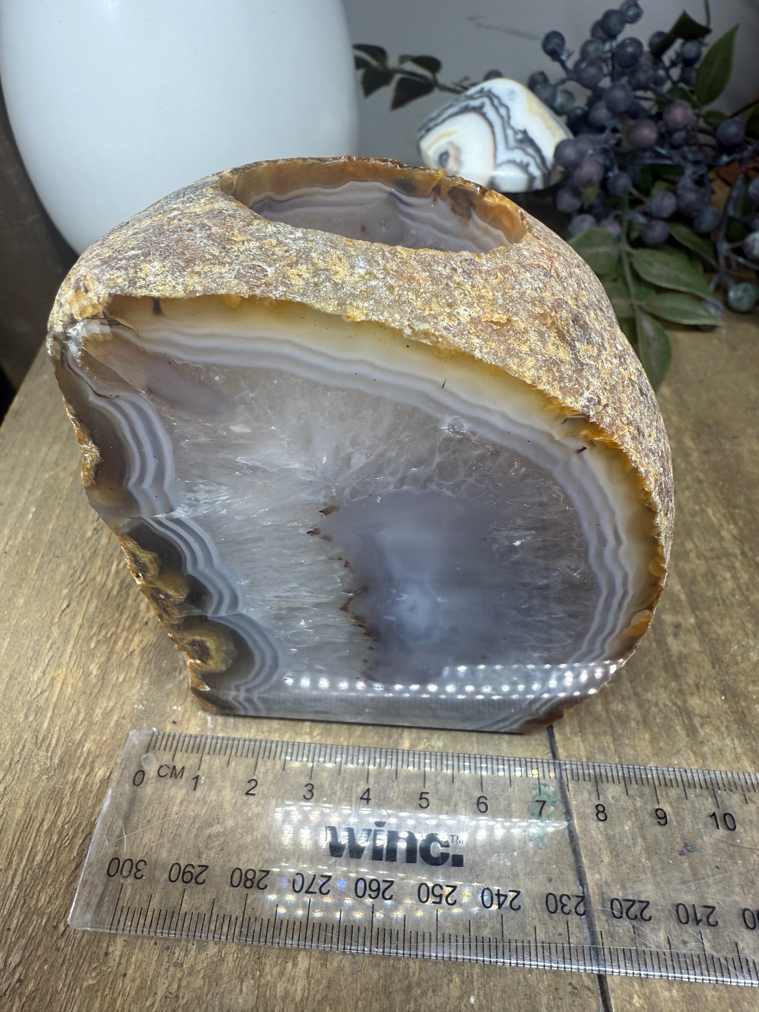 Illuminate your space with the calming energy of this Natural Agate Tea Light Candle Holder. Hand‑crafted from genuine agate stone, each piece is cut in half, and polished to reveal its naturally occurring rings, sparkling geodes, and crystal formations. Designed to hold a tea light candle, this crystal décor piece blends functionality with natural beauty.