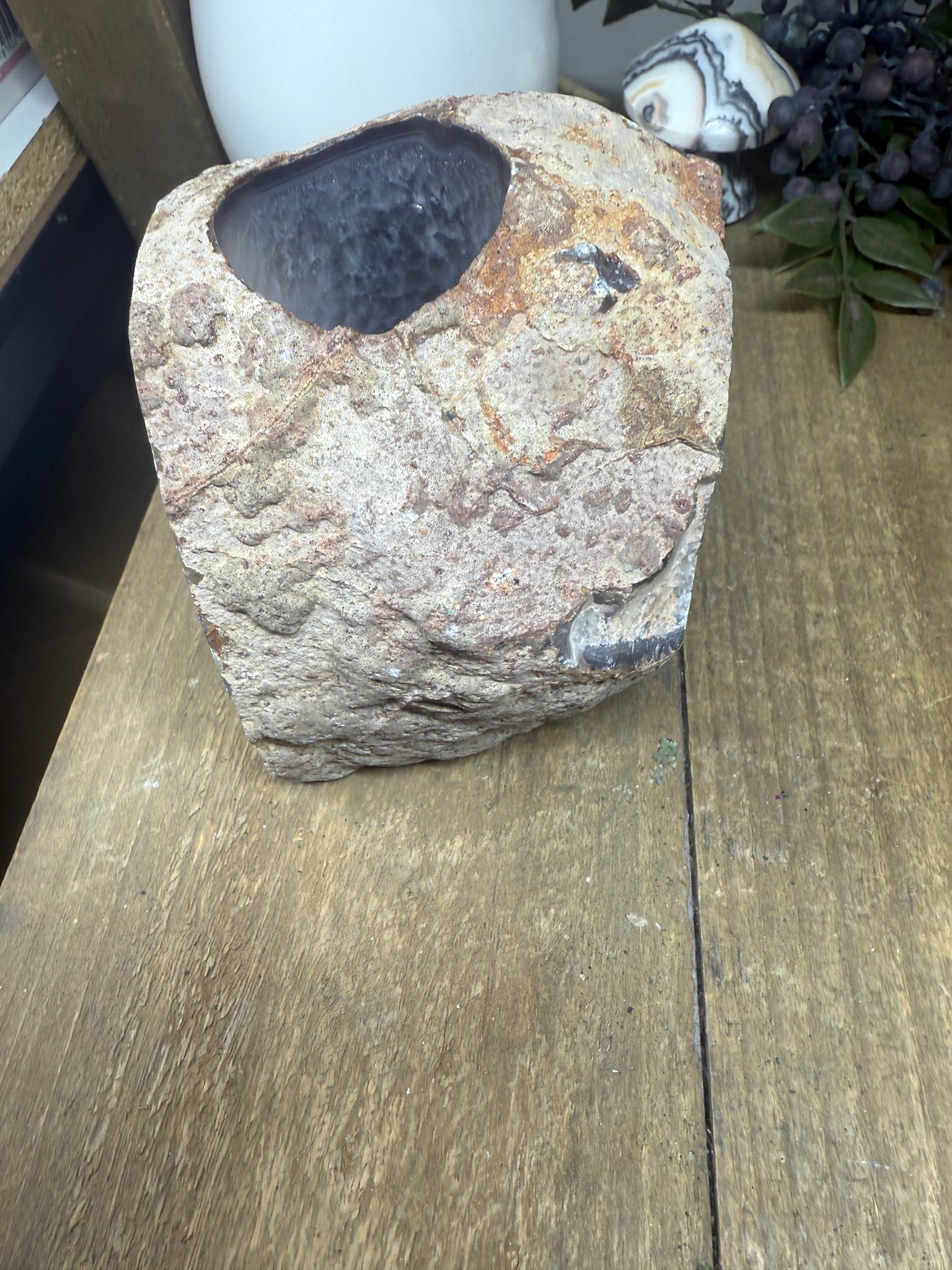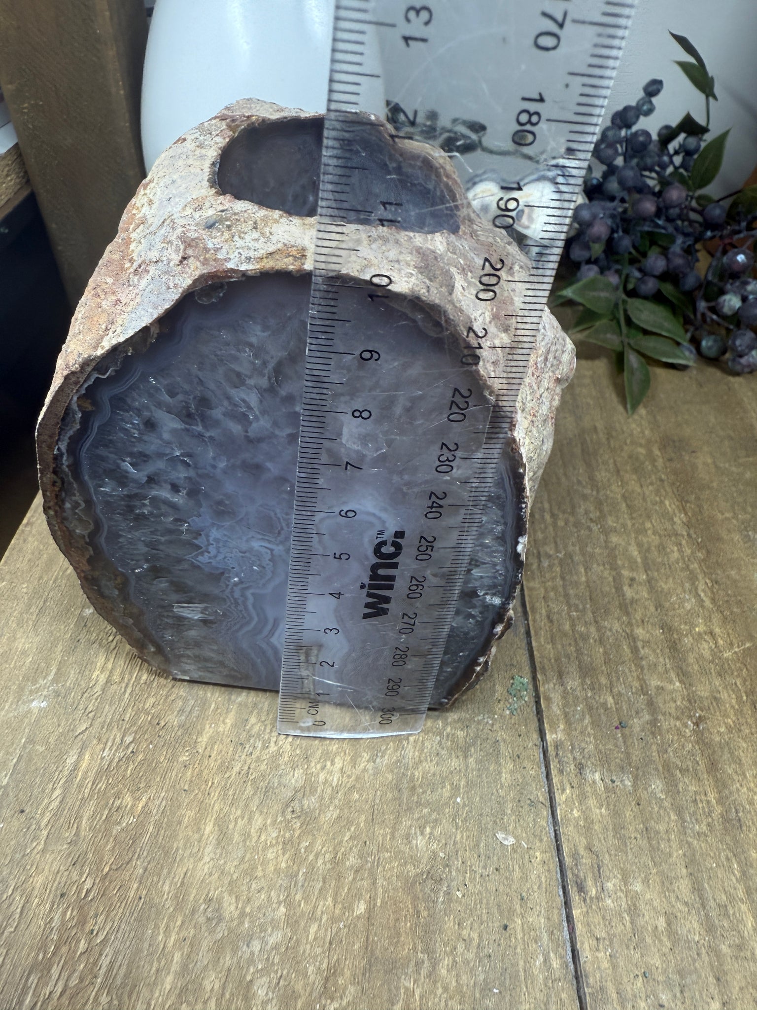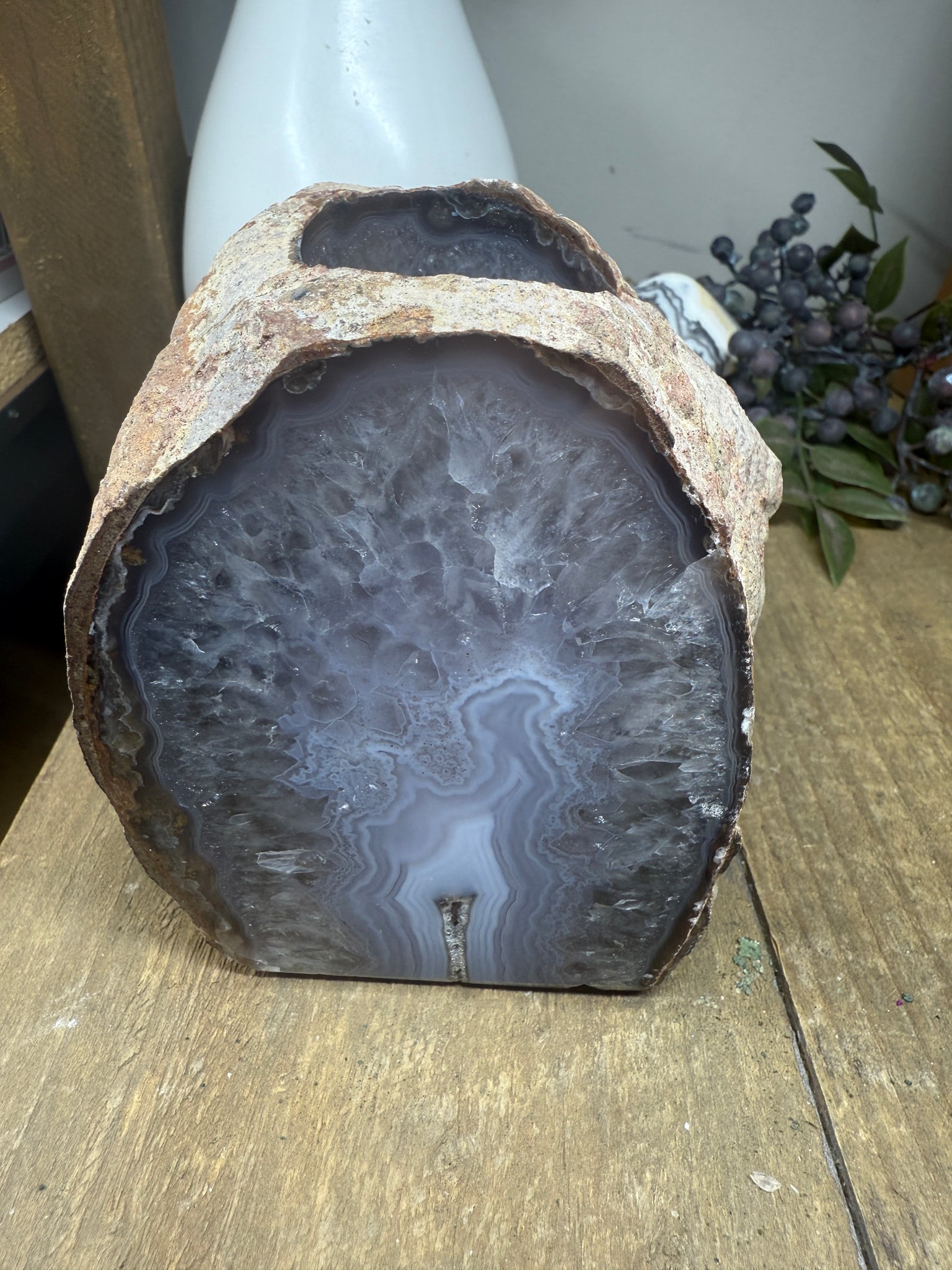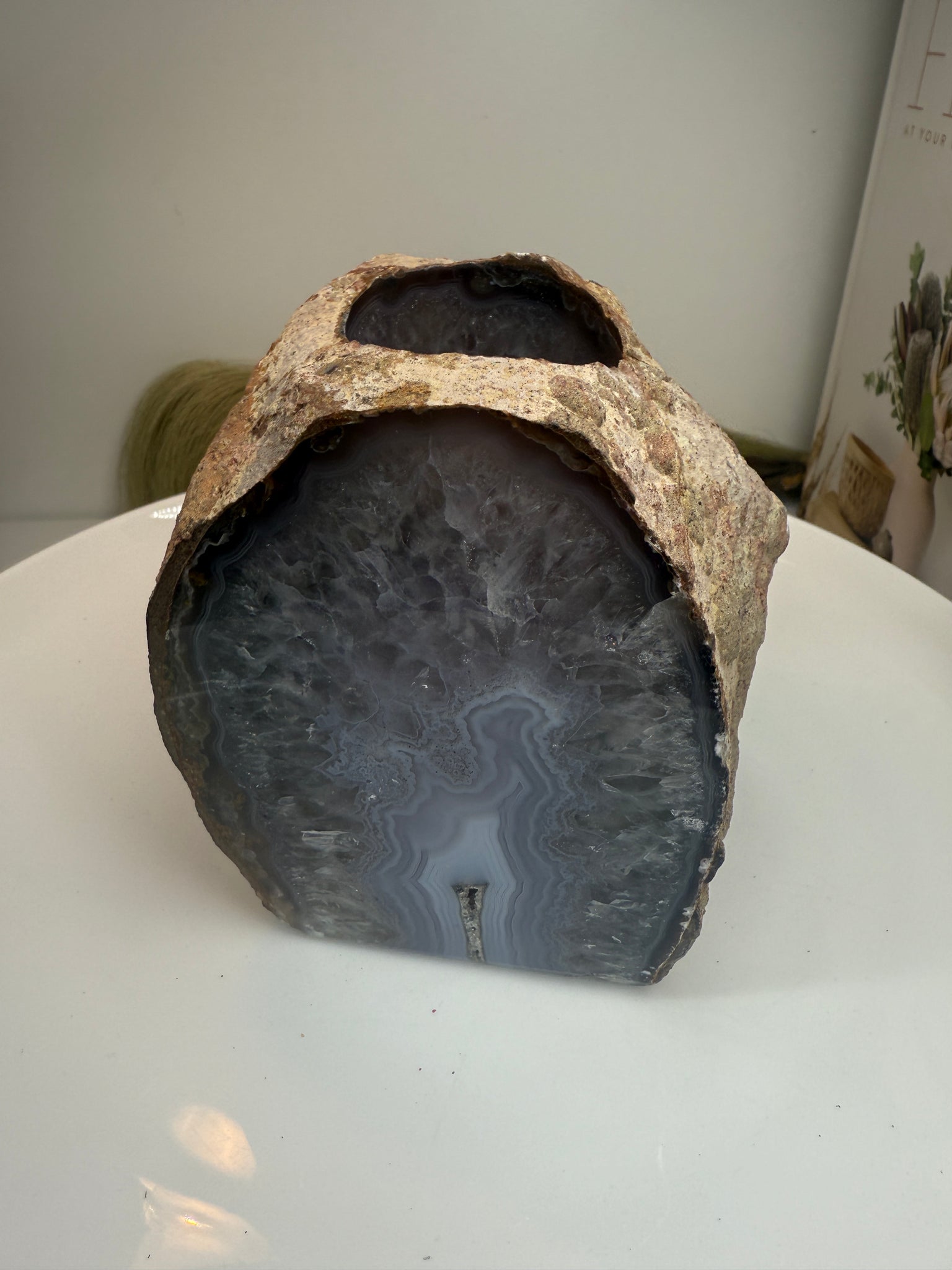 Illuminate your space with the calming energy of this Natural Agate Tea Light Candle Holder. Hand‑crafted from genuine agate stone, each piece is cut in half, and polished to reveal its naturally occurring rings, sparkling geodes, and crystal formations. Designed to hold a tea light candle, this crystal décor piece blends functionality with natural beauty.
