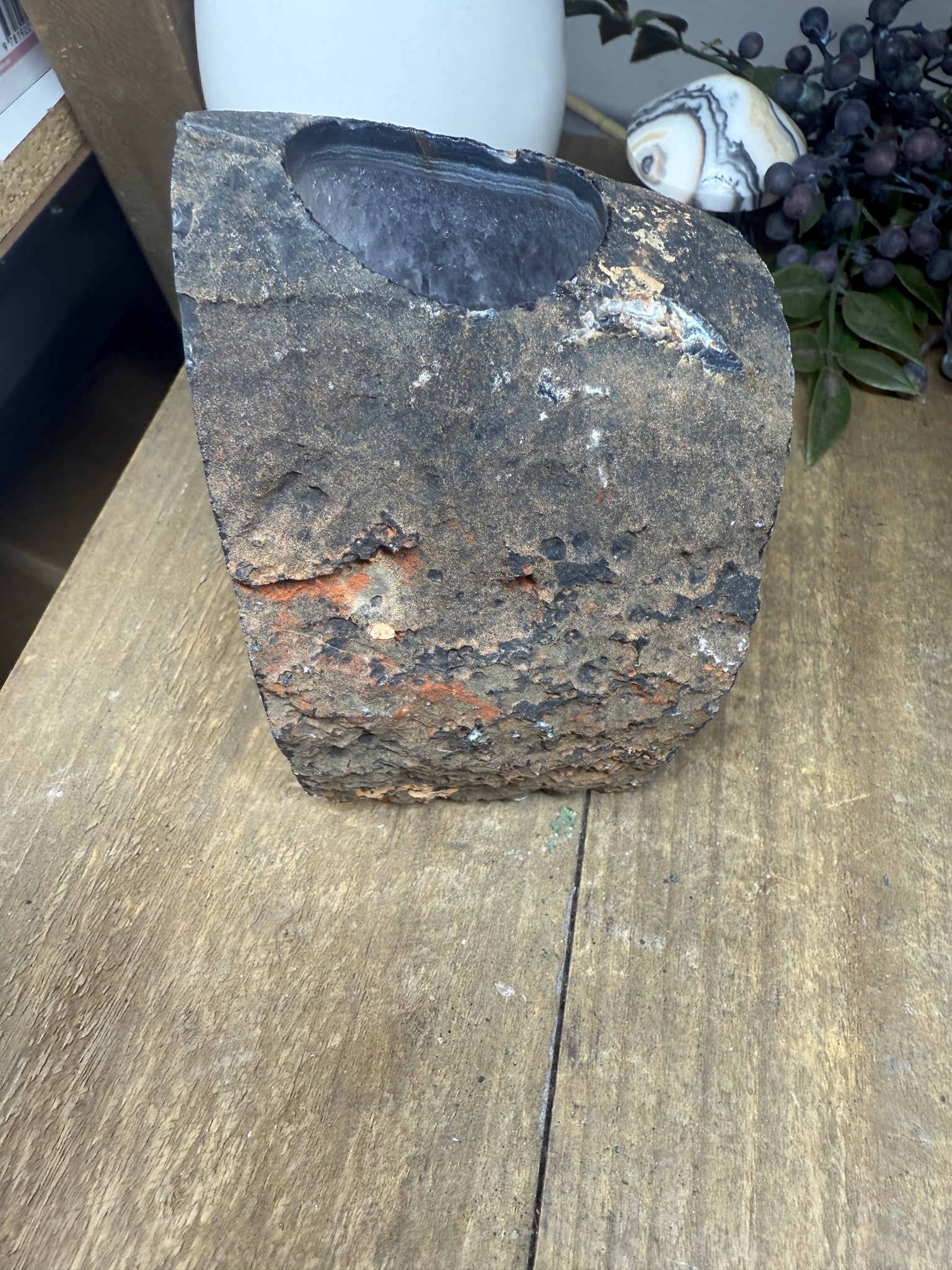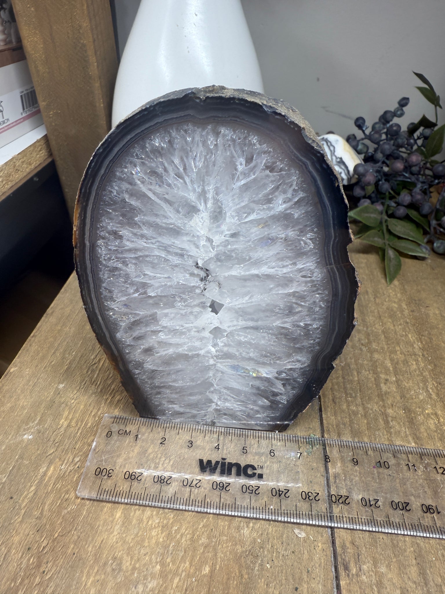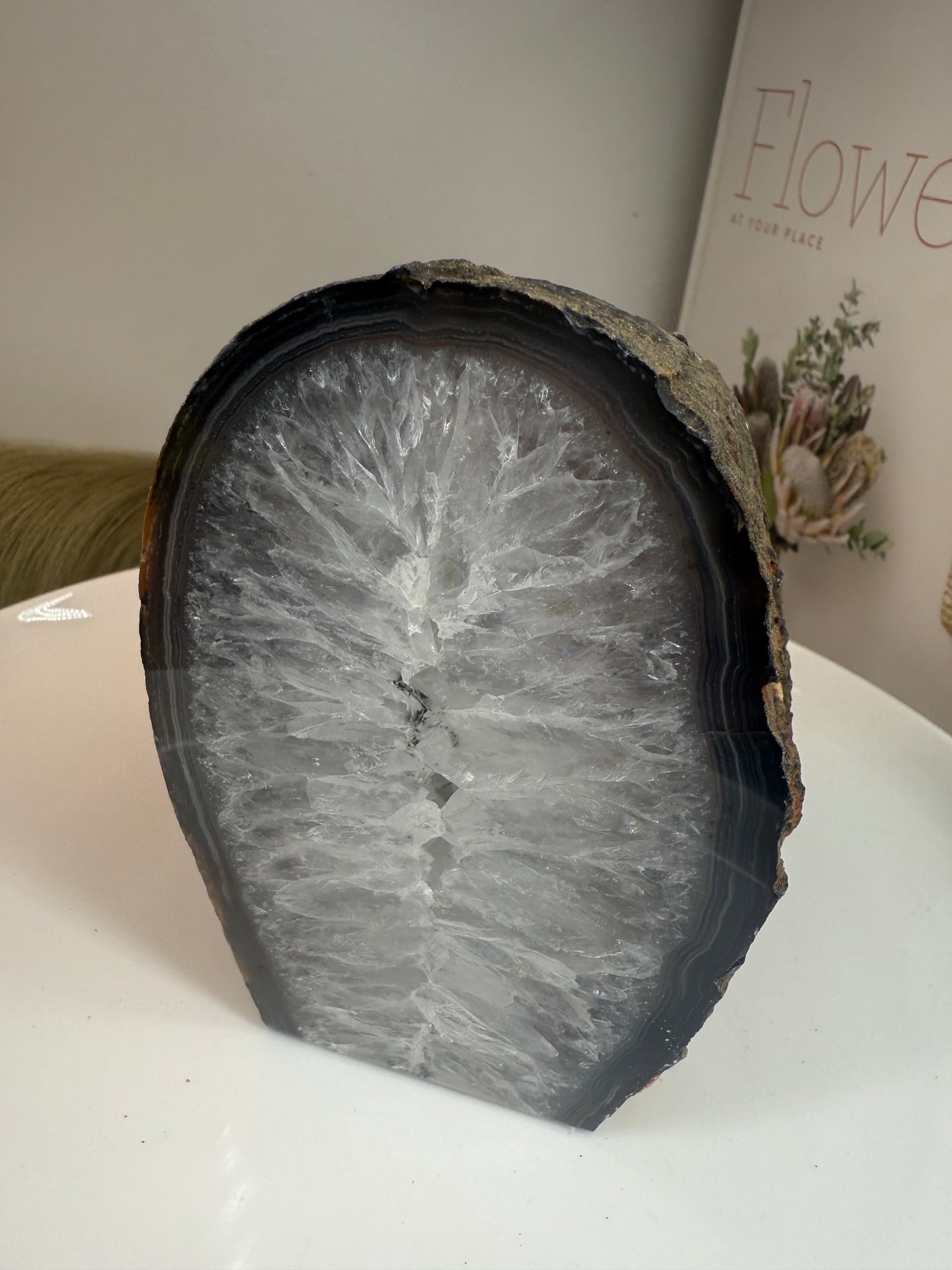 Illuminate your space with the calming energy of this Natural Agate Tea Light Candle Holder. Hand‑crafted from genuine agate stone, each piece is cut in half, and polished to reveal its naturally occurring rings, sparkling geodes, and crystal formations. Designed to hold a tea light candle, this crystal décor piece blends functionality with natural beauty.