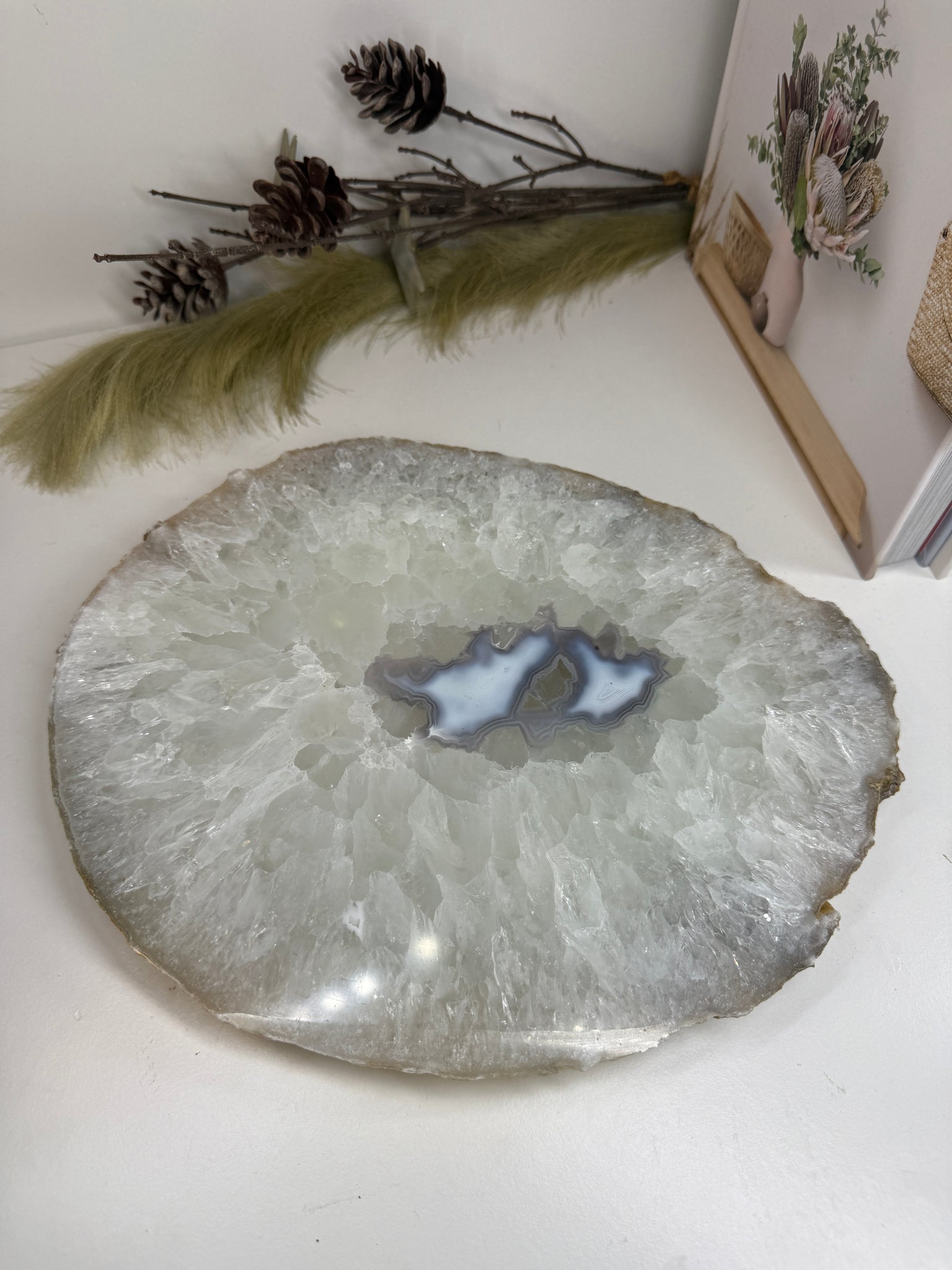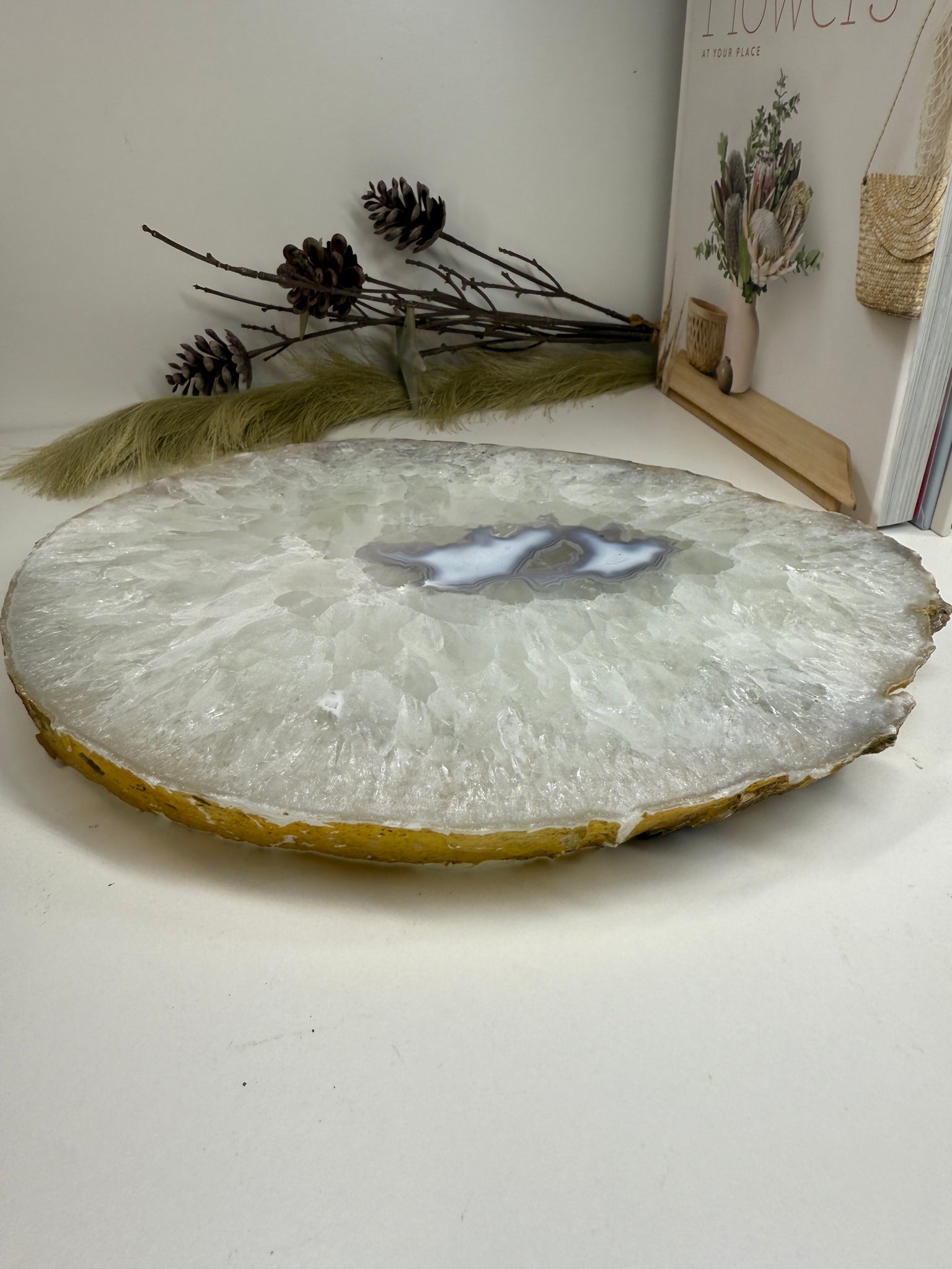 This large, thick polished natural Agate slice is a stunning and versatile piece, perfect for elevating your entertaining platter, using as a unique decorative plate, or simply displaying as a beautiful natural stone feature in your home.