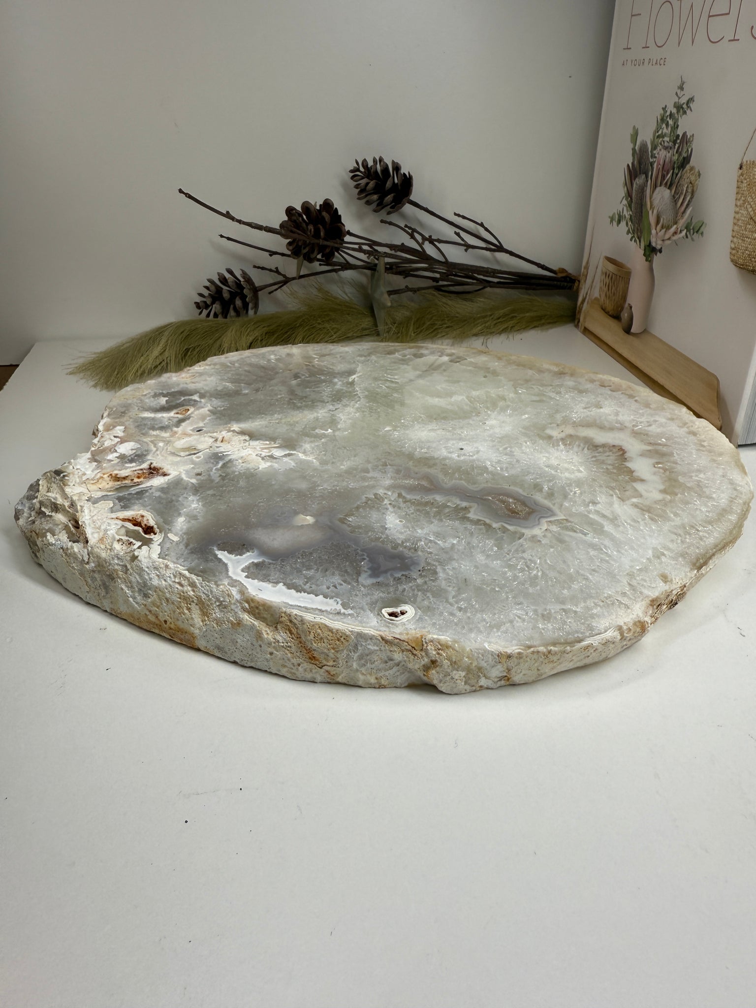 This large, thick polished natural Agate slice is a stunning and versatile piece, perfect for elevating your entertaining platter, using as a unique decorative plate, or simply displaying as a beautiful natural stone feature in your home.