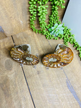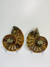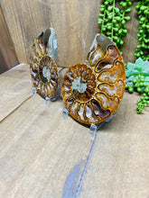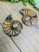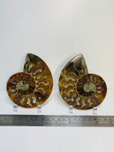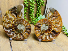 These fossils consist of an Ammonite cut in half and polished to create a gorgeous pair. This matching pair have been cut in half and then polished on one side to reveal it's generous colours, internal caves and patterns.