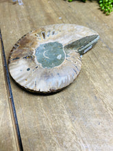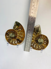 The Ammonite pair are each approximately 11cm long, 9cm wide and 1cm thick and weigh approximately 290g. The stand as shown in the photographs comes complimentary with this purchase.