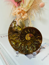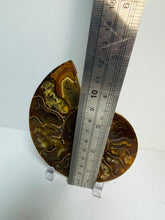 These fossils consist of an Ammonite cut in half and polished to create a gorgeous pair. This Ammonite has been cut in half and then polished on one side to reveal it's generous colours, internal caves and patterns.