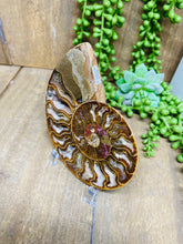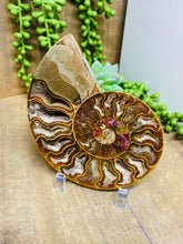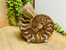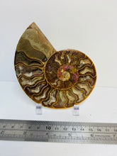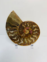These fossils consist of an Ammonite cut in half and polished to create a gorgeous pair. This Ammonite has been cut in half and then polished on one side to reveal it's generous colours, internal caves and patterns.
