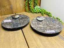 The fossil dish are approximately 16cm by 16cm and 2.5cm high and weigh approximately 420g each.