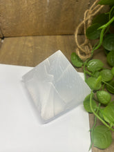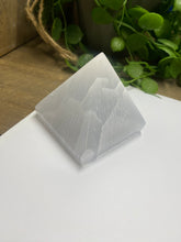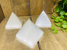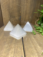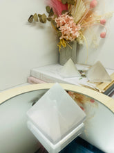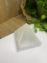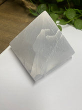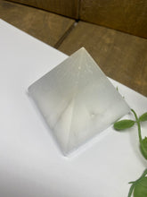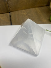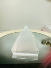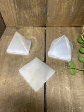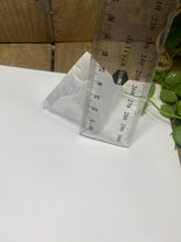 Selenite pyramid. Selenite is a soft natural stone that has been caved into the shape of a pyramid. This pyramid could easily be used as a paper weight in an office or a beautiful display piece.