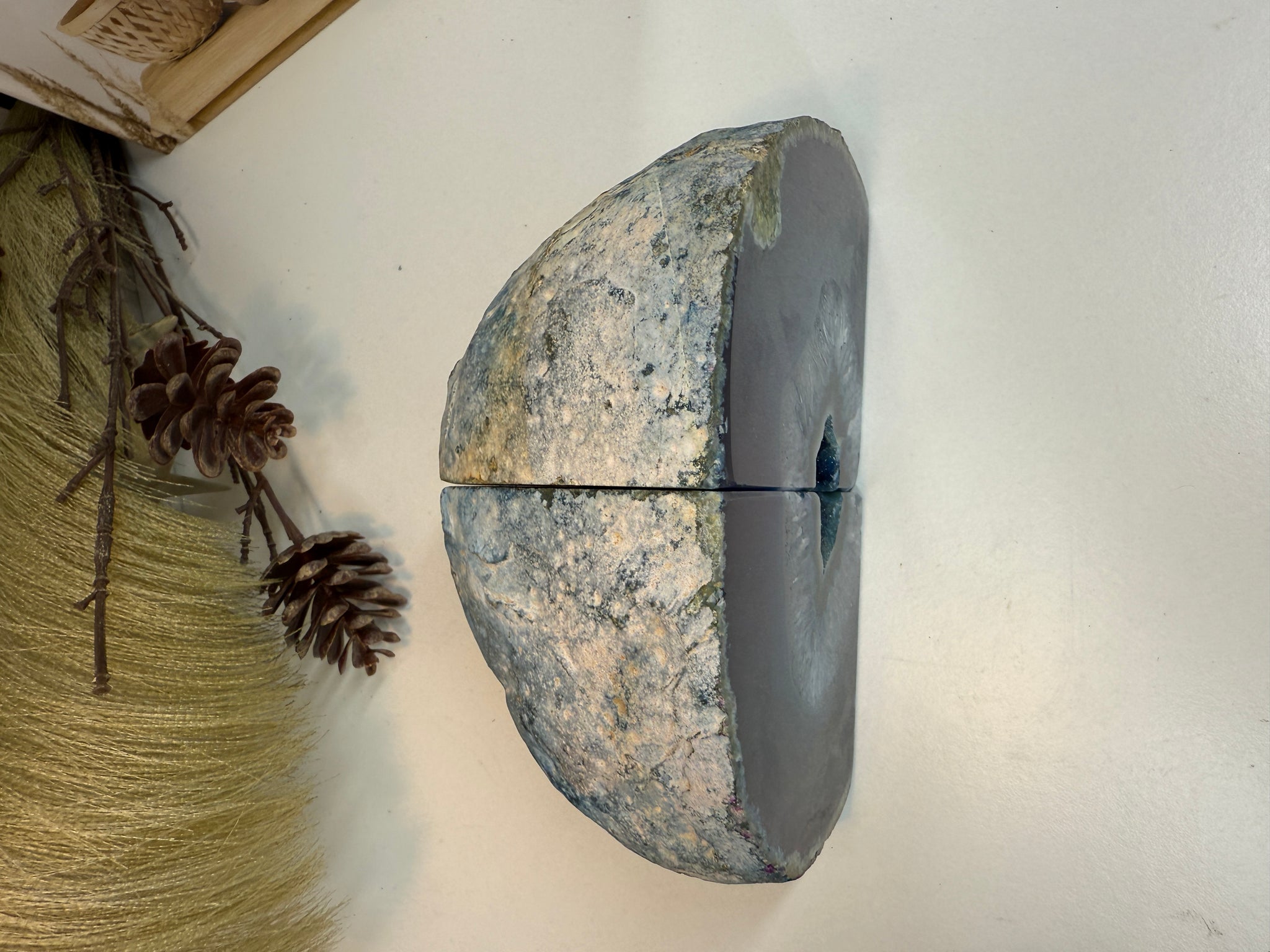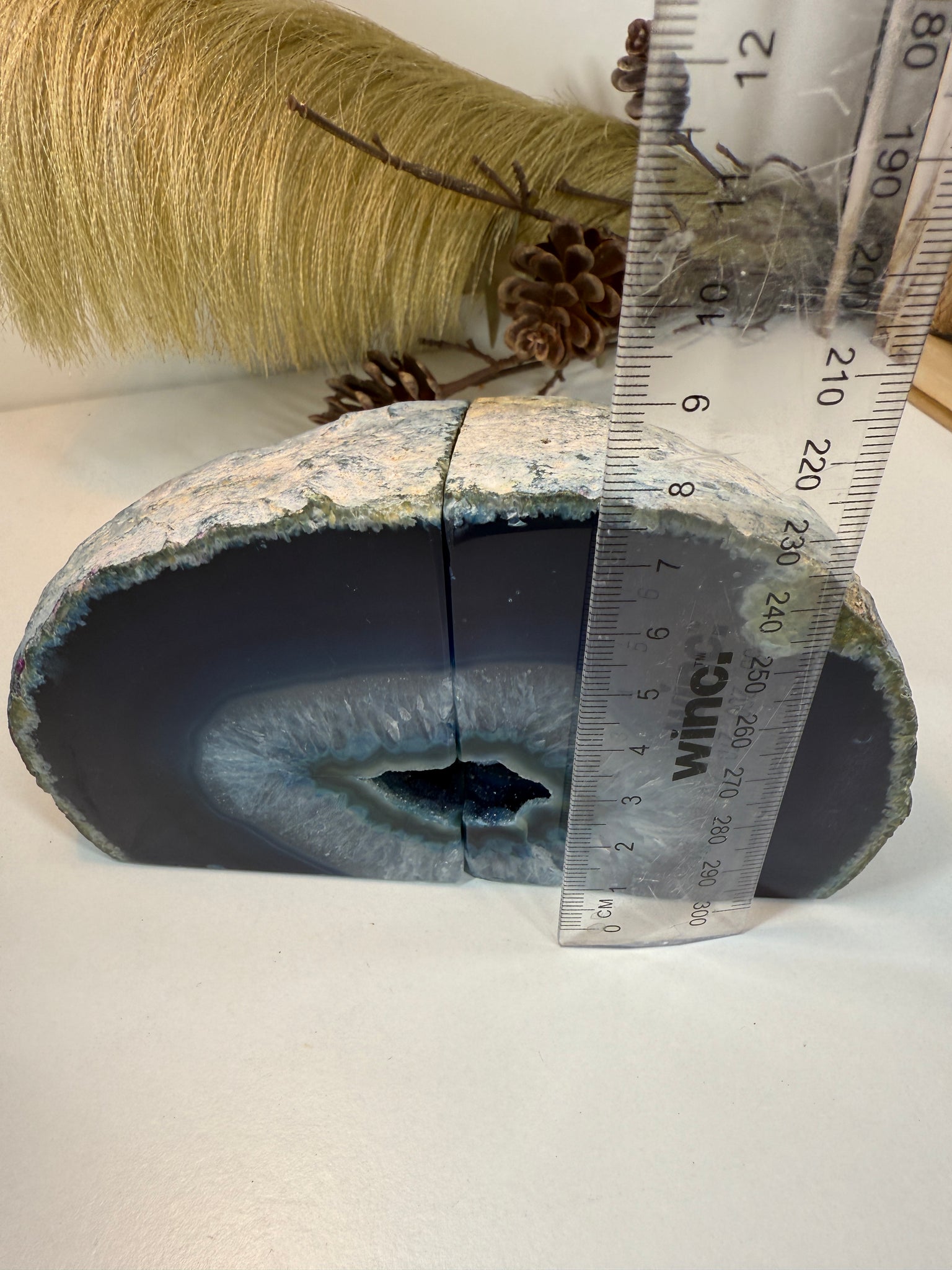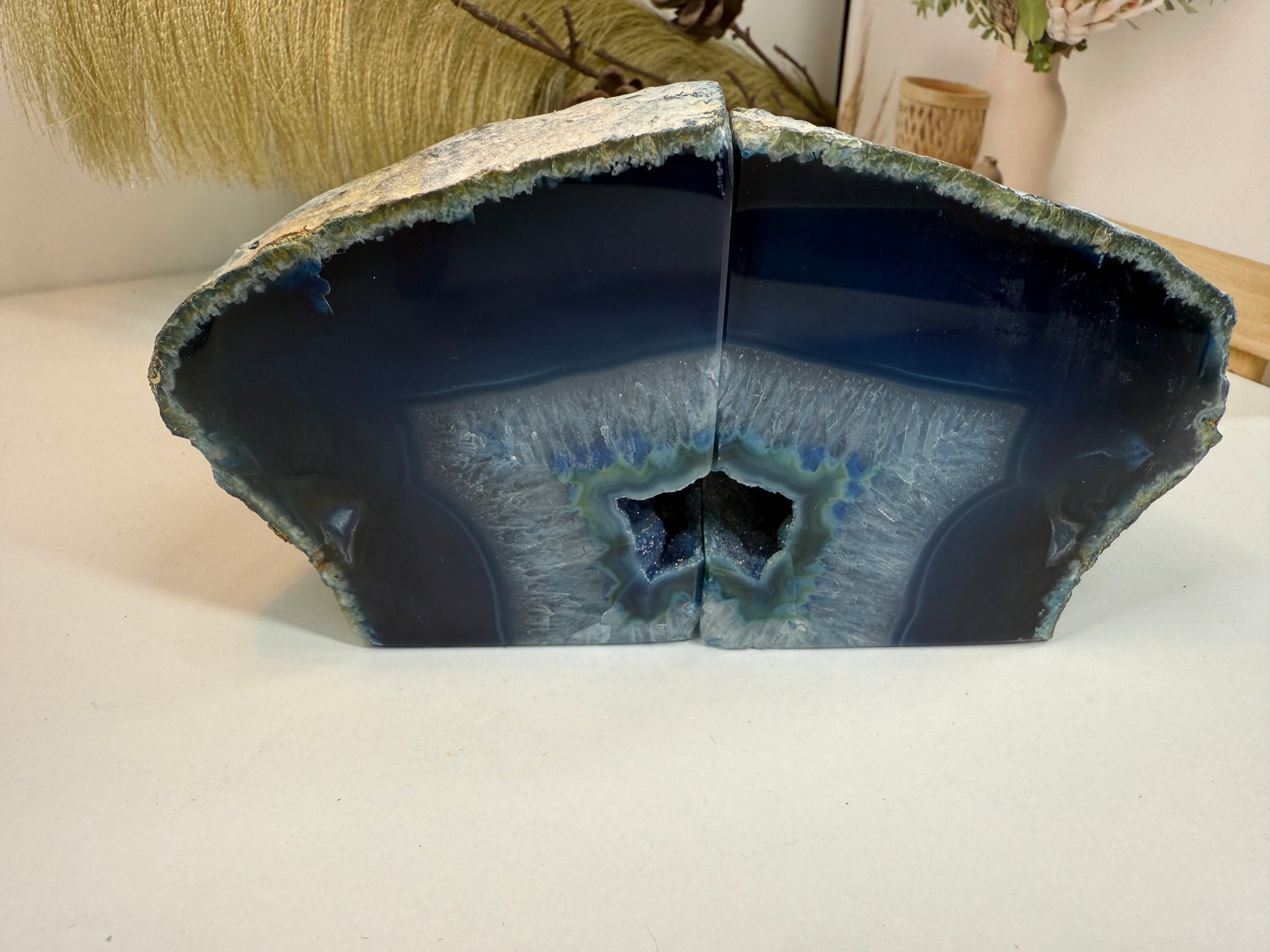 Polished blue Agate book ends. These book ends are a natural stone, cut in half, coloured and then polished to reveal naturally occurring patterned rings, geodes and crystals inside. These bookends are truly unique as they can be used in different directions (see photographs where it changes the look).