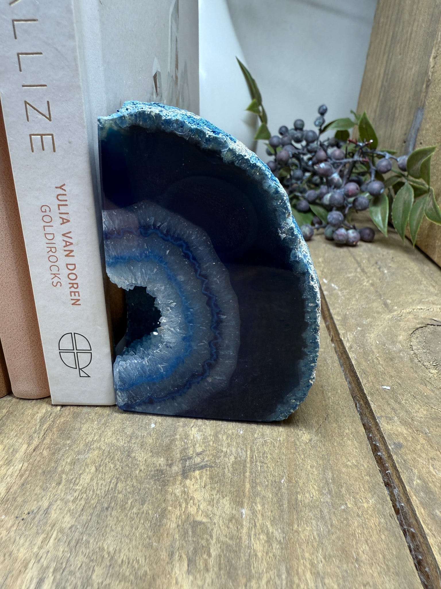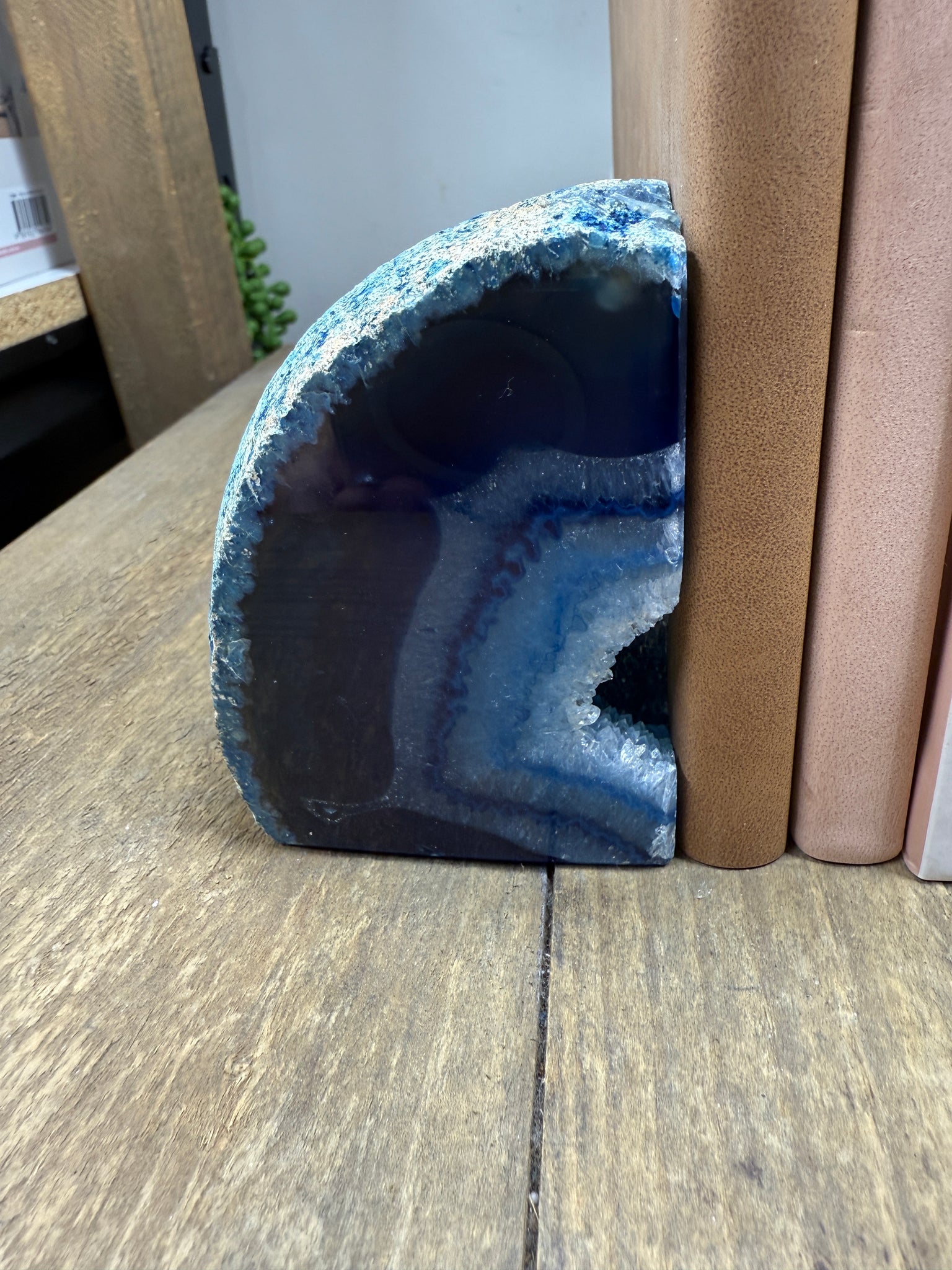 Polished blue Agate book ends. These book ends are a natural stone, cut in half, coloured and then polished to reveal naturally occurring patterned rings, geodes and crystals inside. These bookends are truly unique as they can be used in different directions (see photographs where it changes the look).