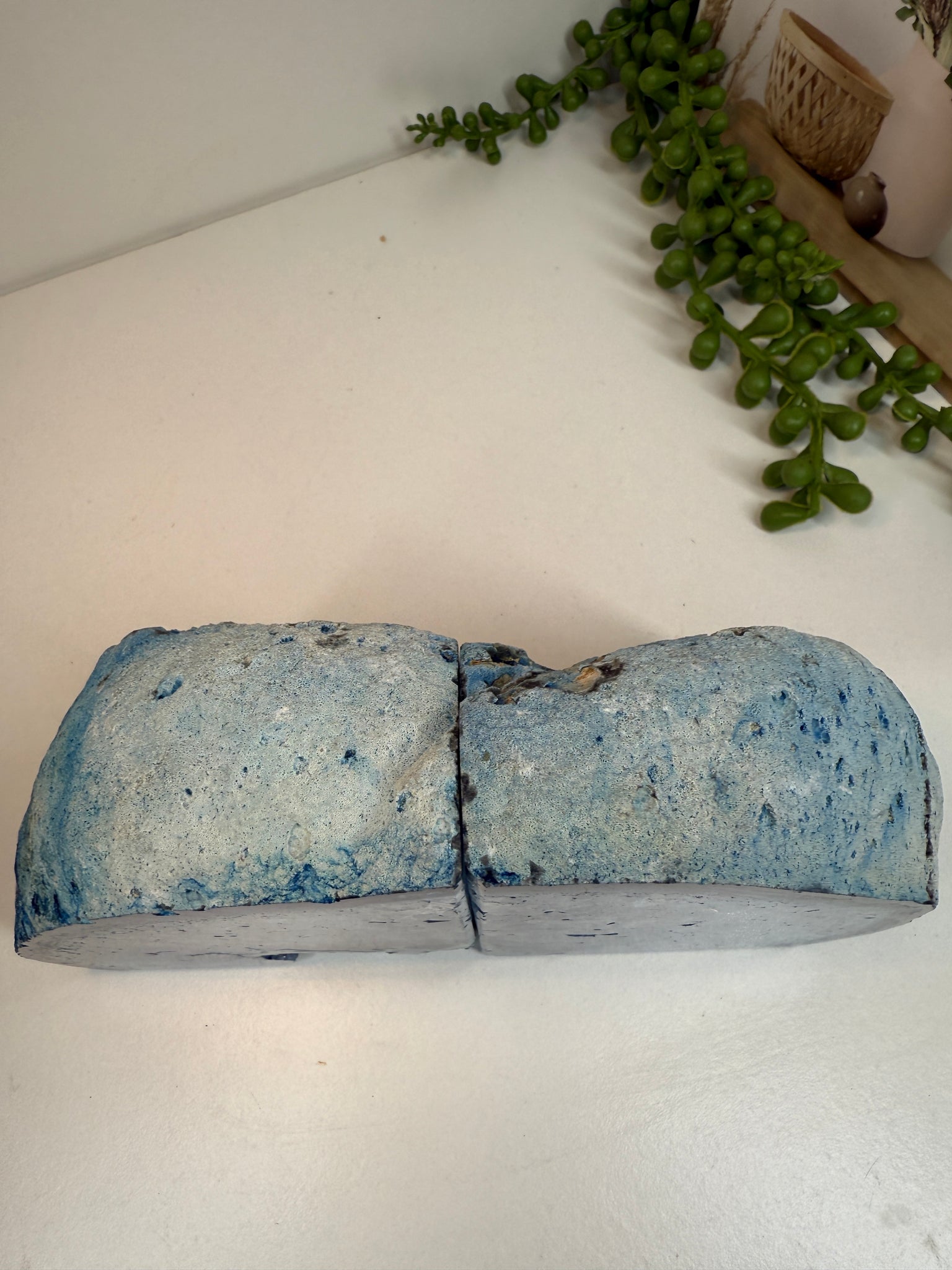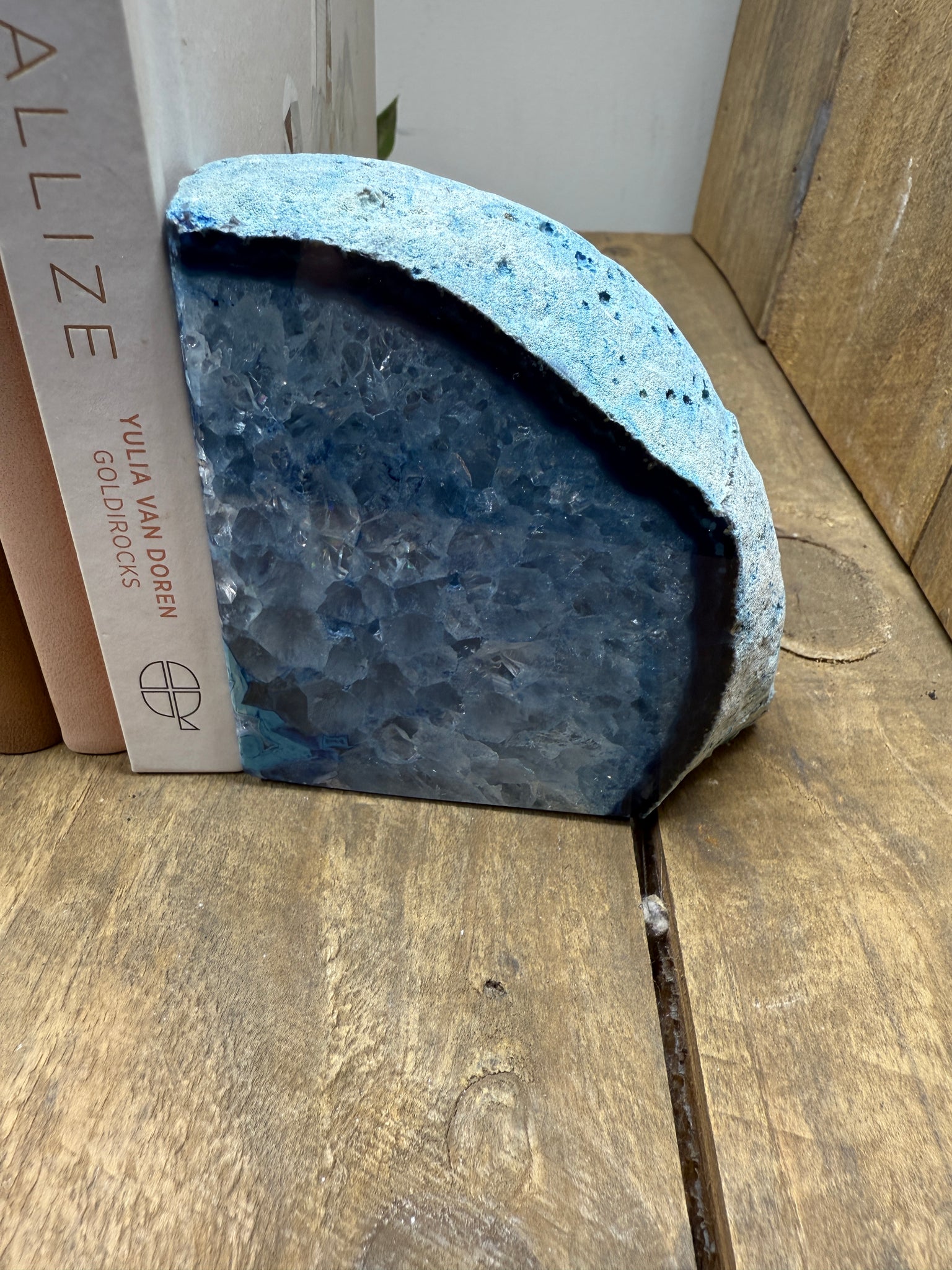 Polished blue Agate book ends. These book ends are a natural stone, cut in half, coloured and then polished to reveal naturally occurring patterned rings, geodes and crystals inside. These bookends are truly unique as they can be used in different directions (see photographs where it changes the look).
