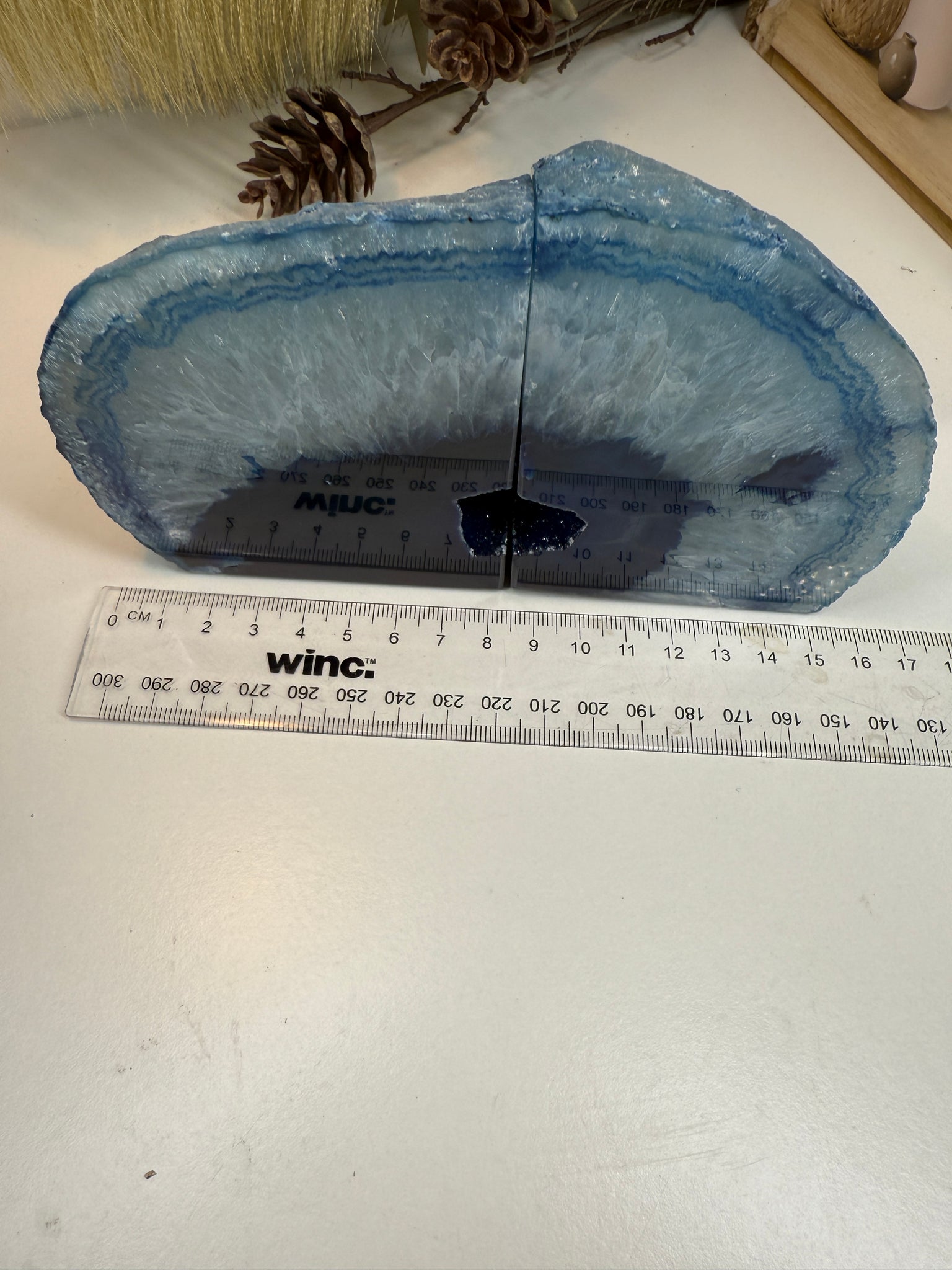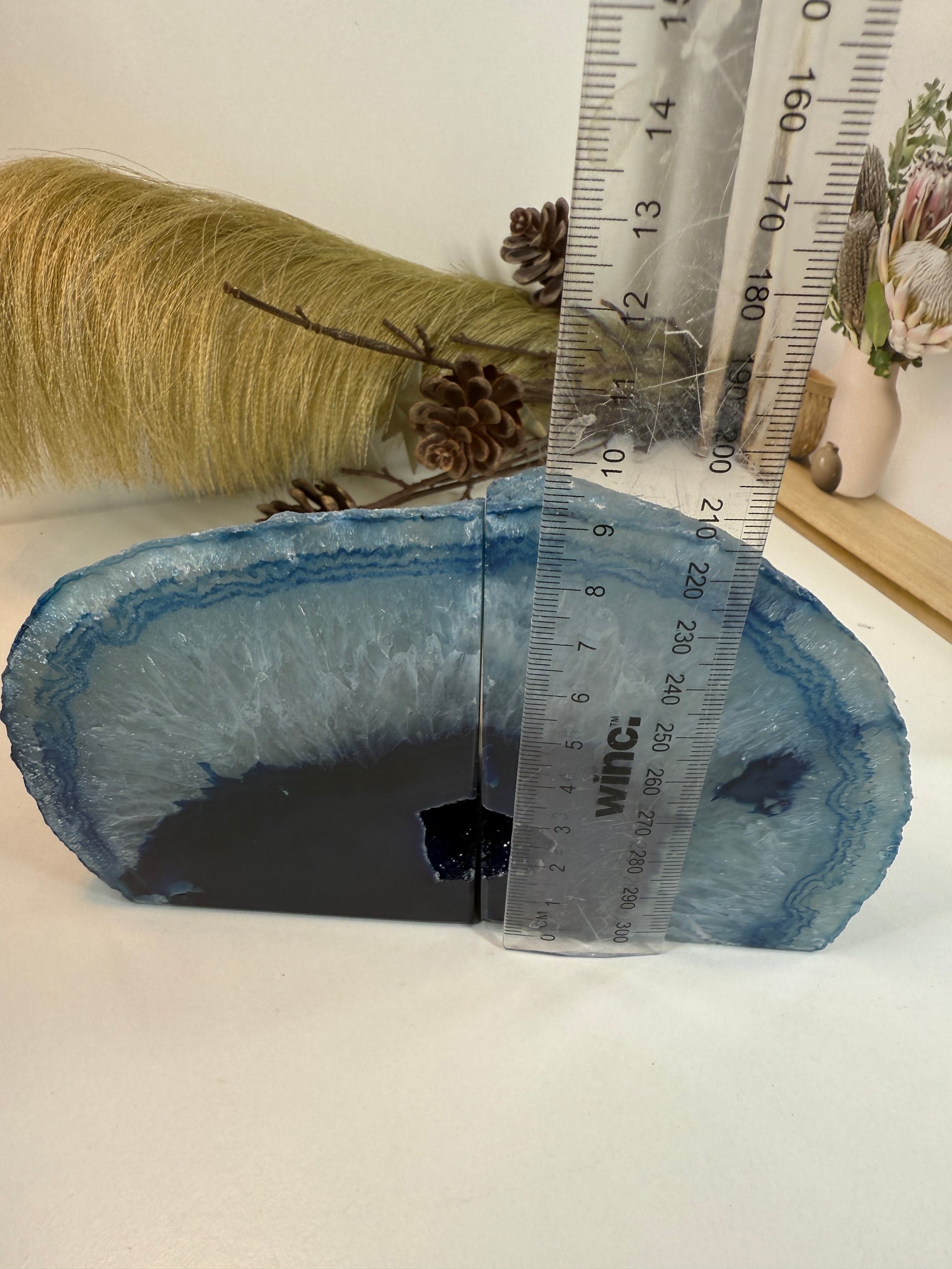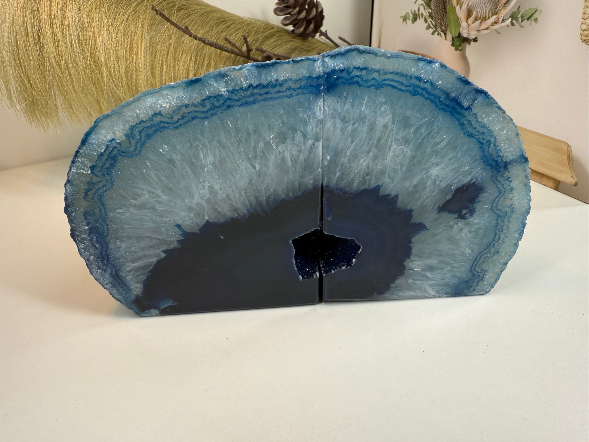 Polished blue Agate book ends. These book ends are a natural stone, cut in half, coloured and then polished to reveal naturally occurring patterned rings, geodes and crystals inside. These bookends are truly unique as they can be used in different directions (see photographs where it changes the look).