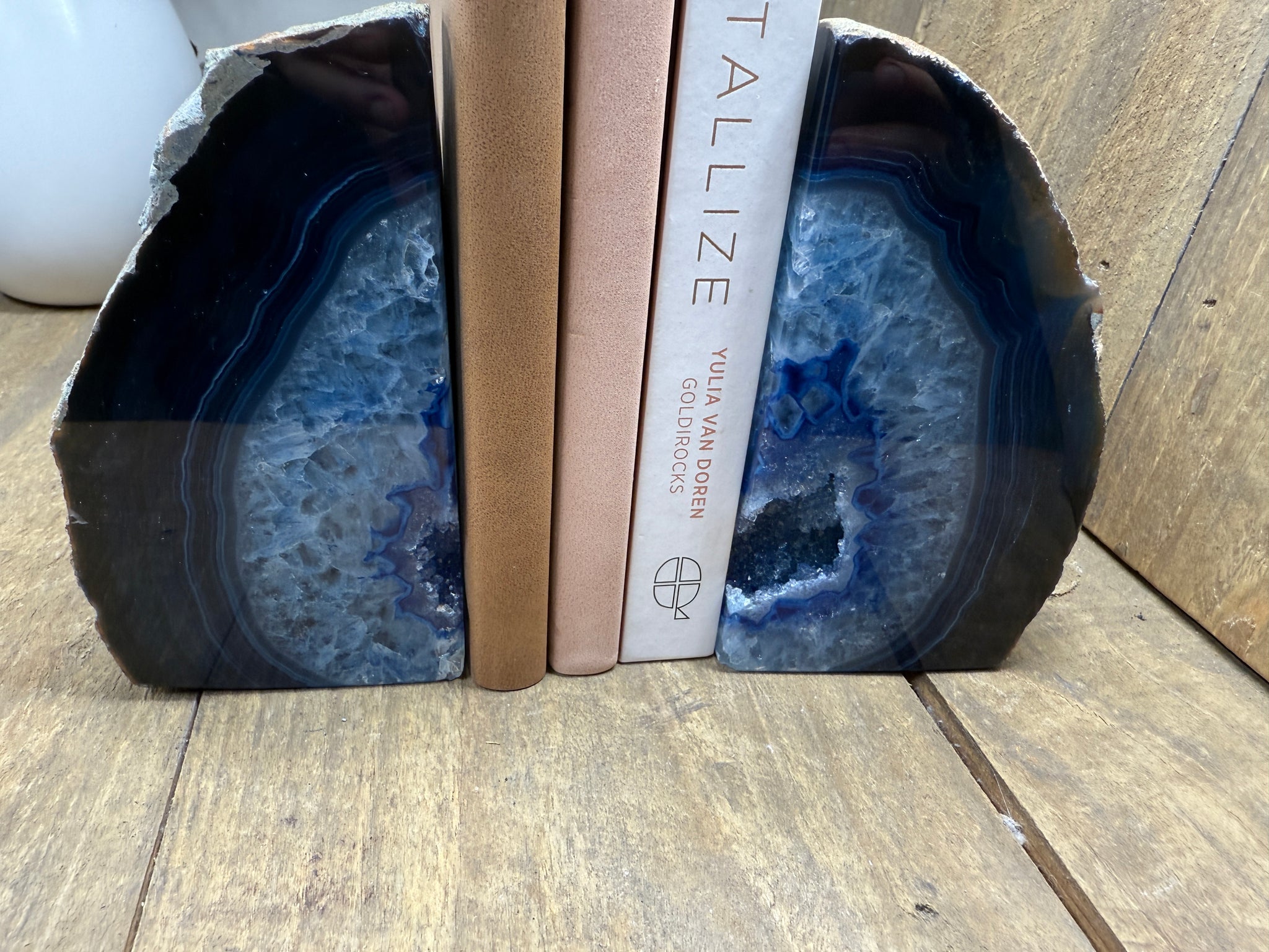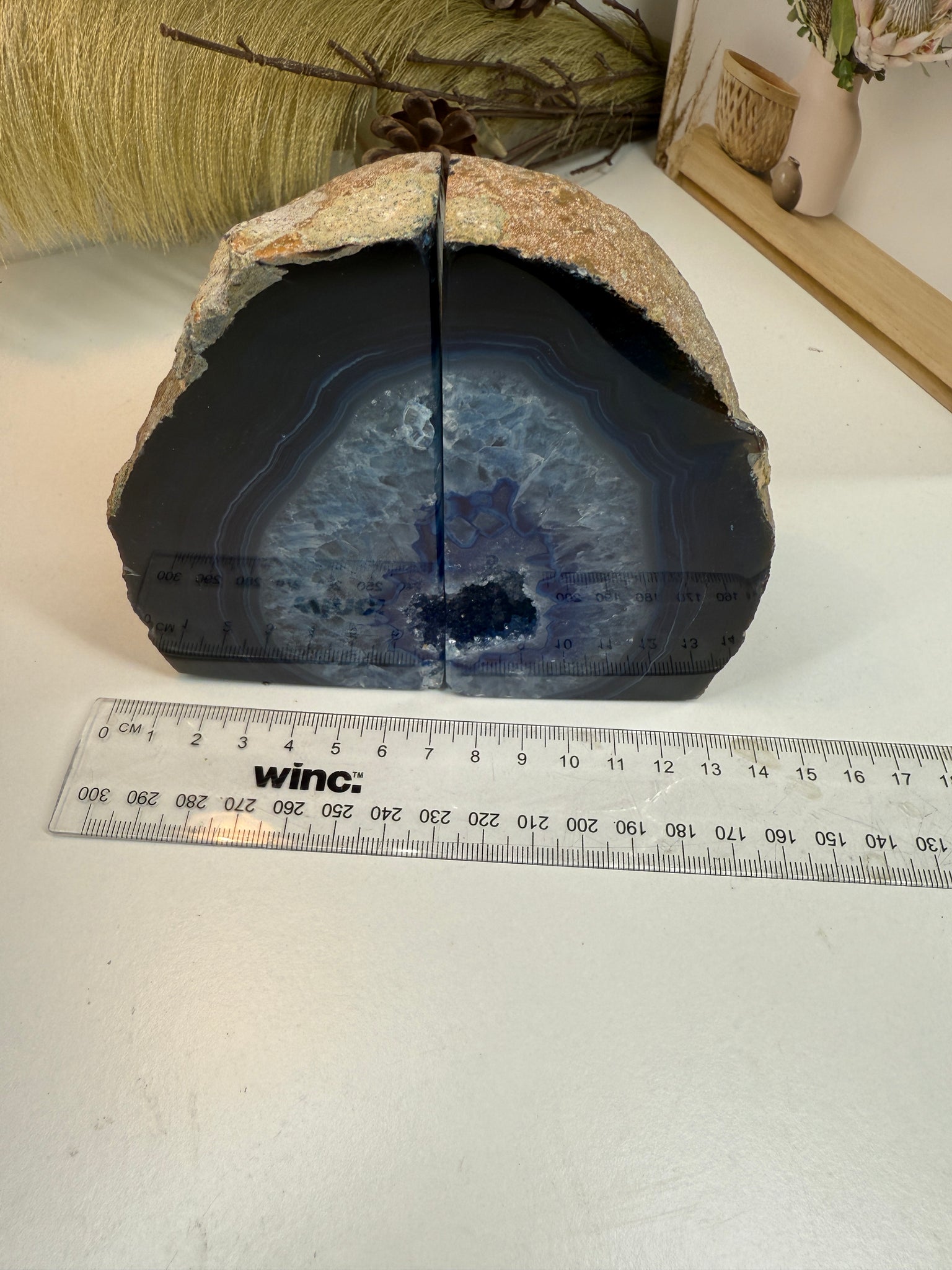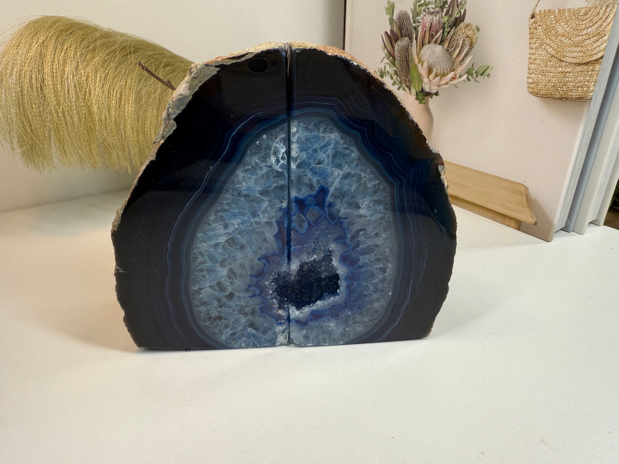Polished blue Agate book ends. These book ends are a natural stone, cut in half, coloured and then polished to reveal naturally occurring patterned rings, geodes and crystals inside. These bookends are truly unique as they can be used in different directions (see photographs where it changes the look).