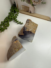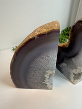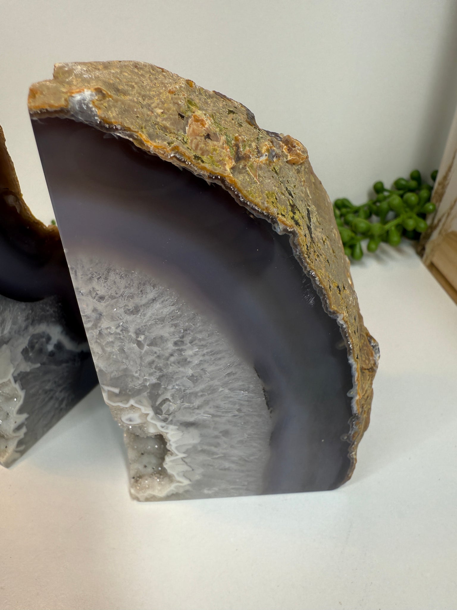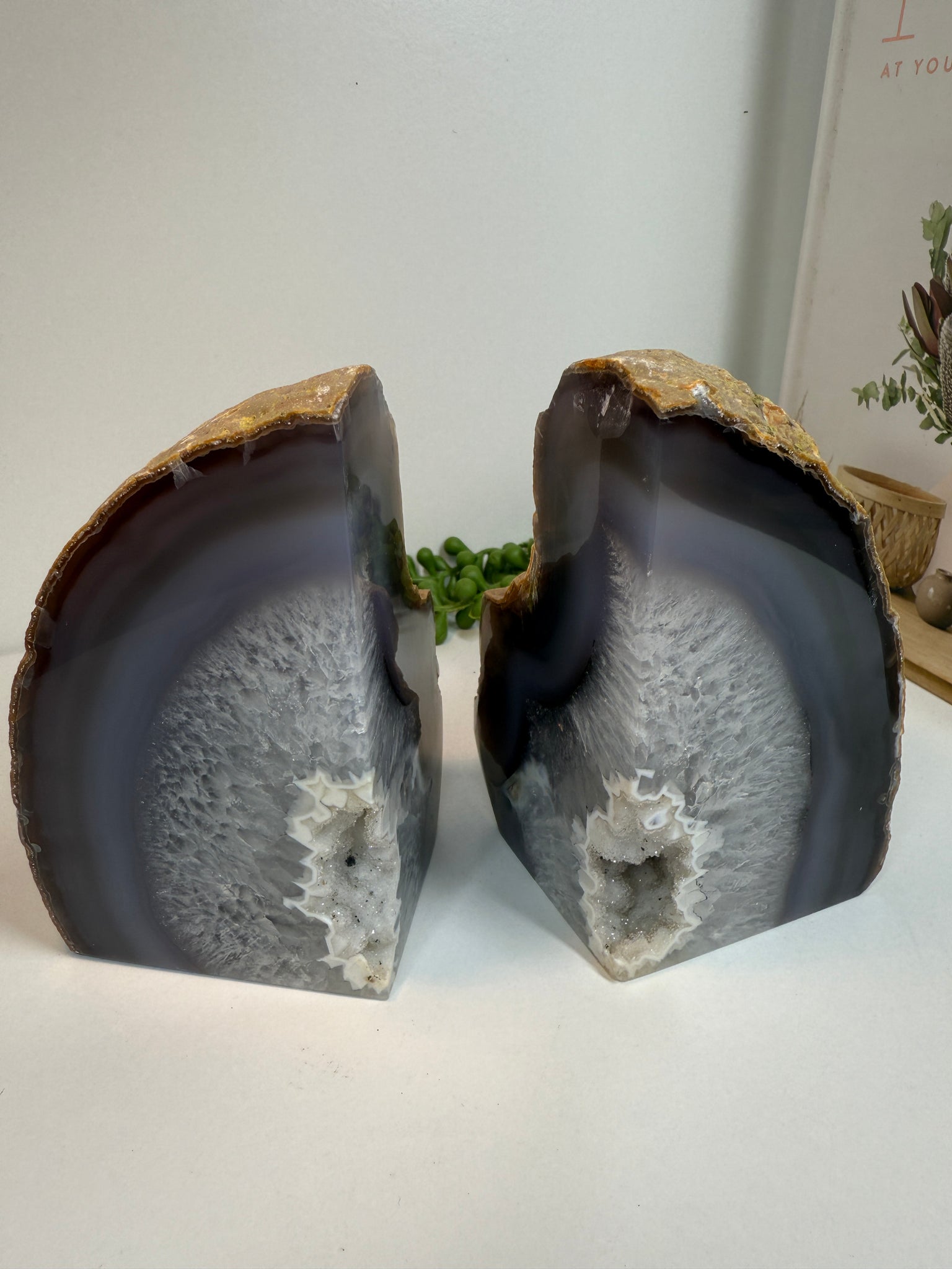Polished Natural Agate book ends. These book ends are a natural stone, cut in half, and then polished to reveal naturally occurring patterned rings, geodes and crystals inside. These bookends are truly unique as they can be used in different directions (see photographs where it changes the look).