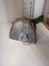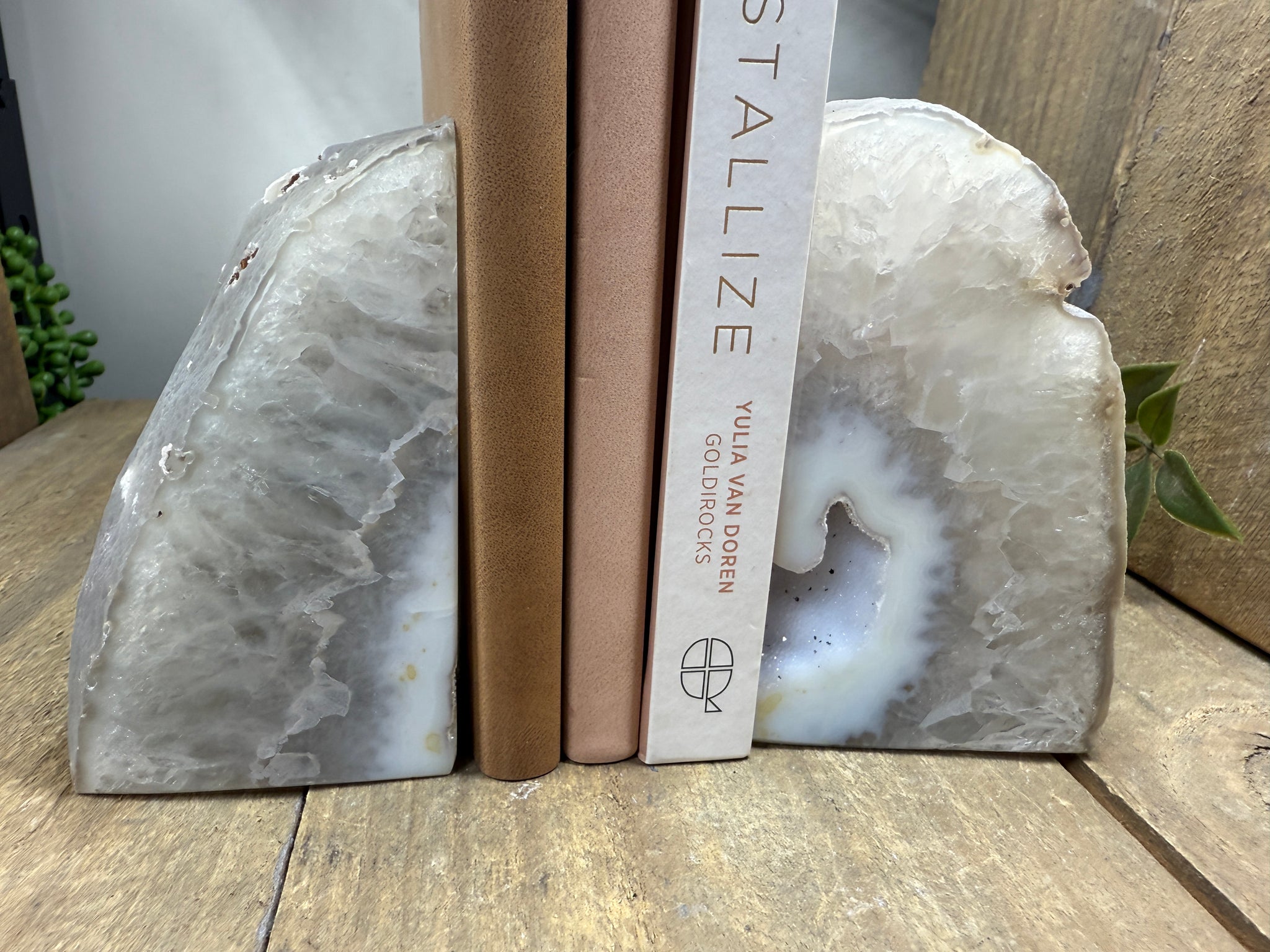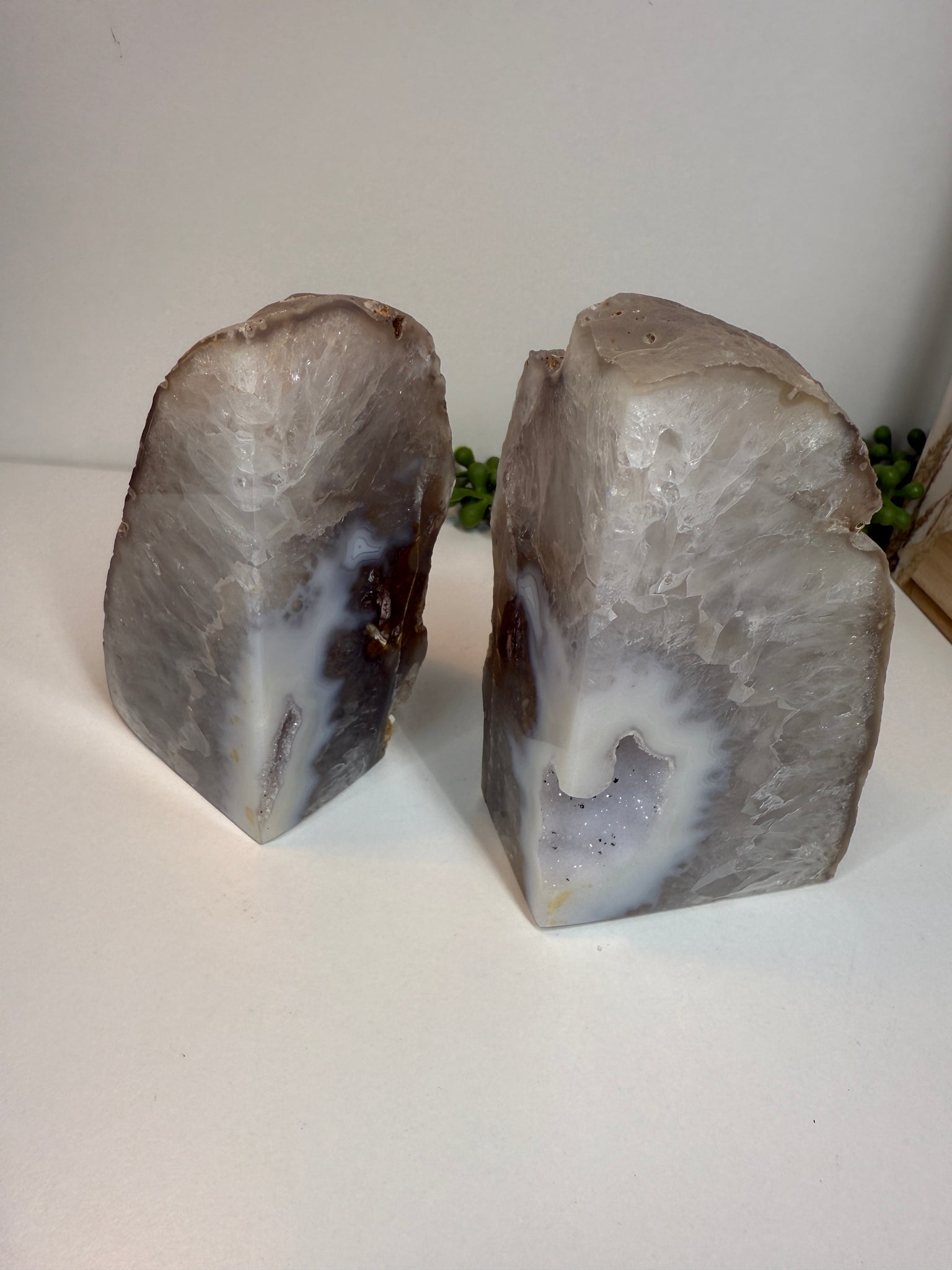 Polished Natural Agate book ends. These book ends are a natural stone, cut in half, and then polished to reveal naturally occurring patterned rings, geodes and crystals inside. These bookends are truly unique as they can be used in different directions (see photographs where it changes the look).