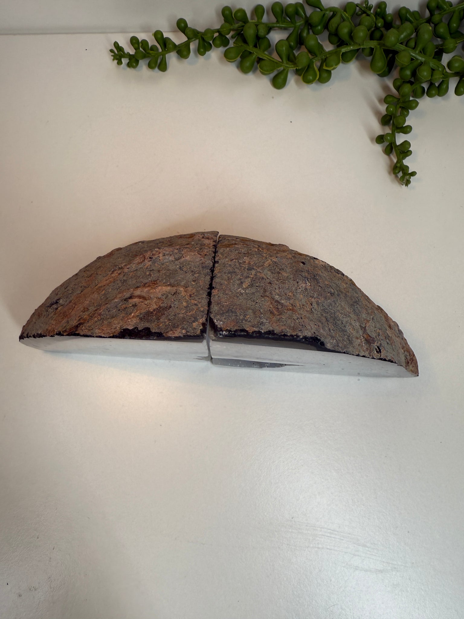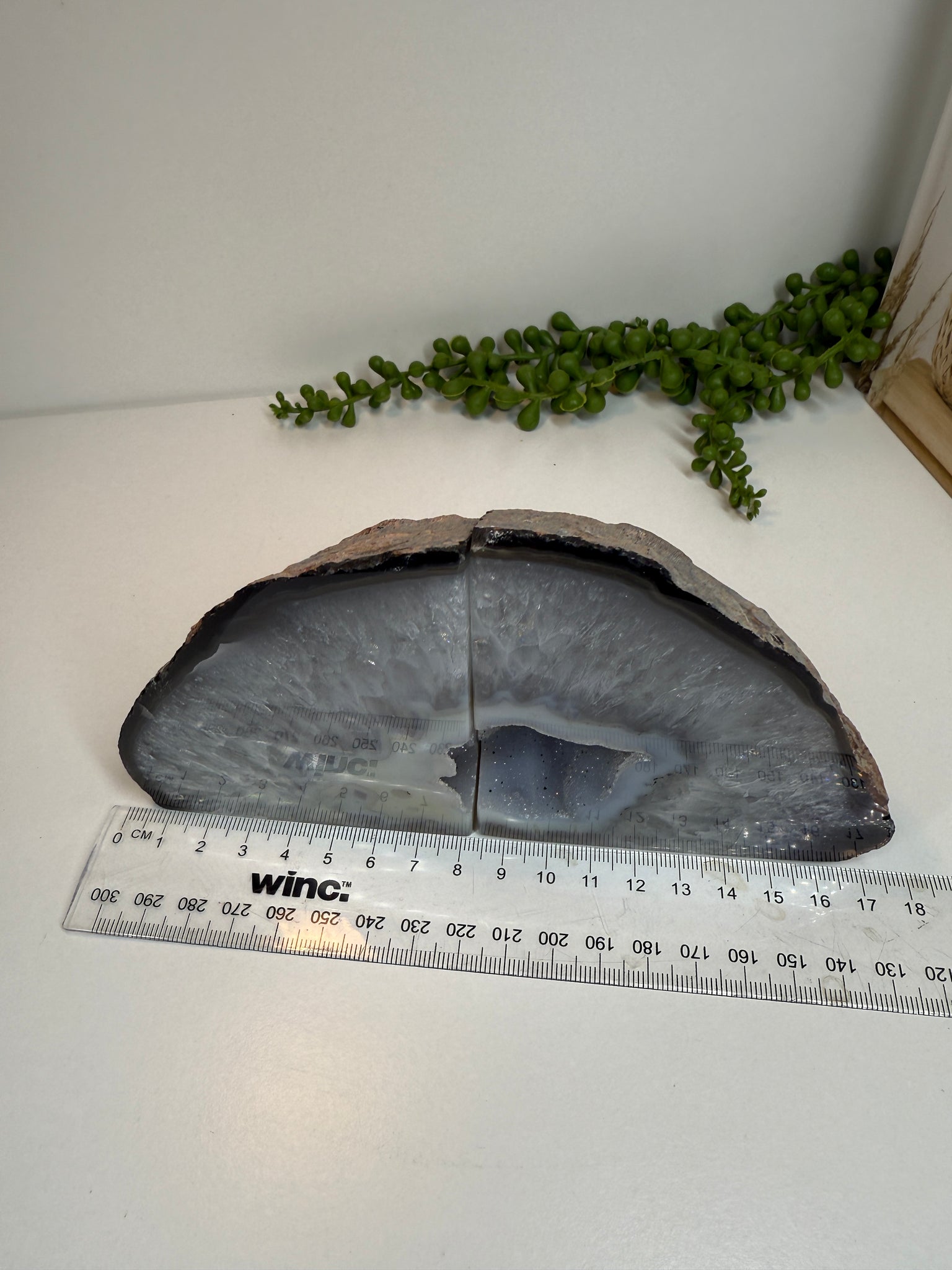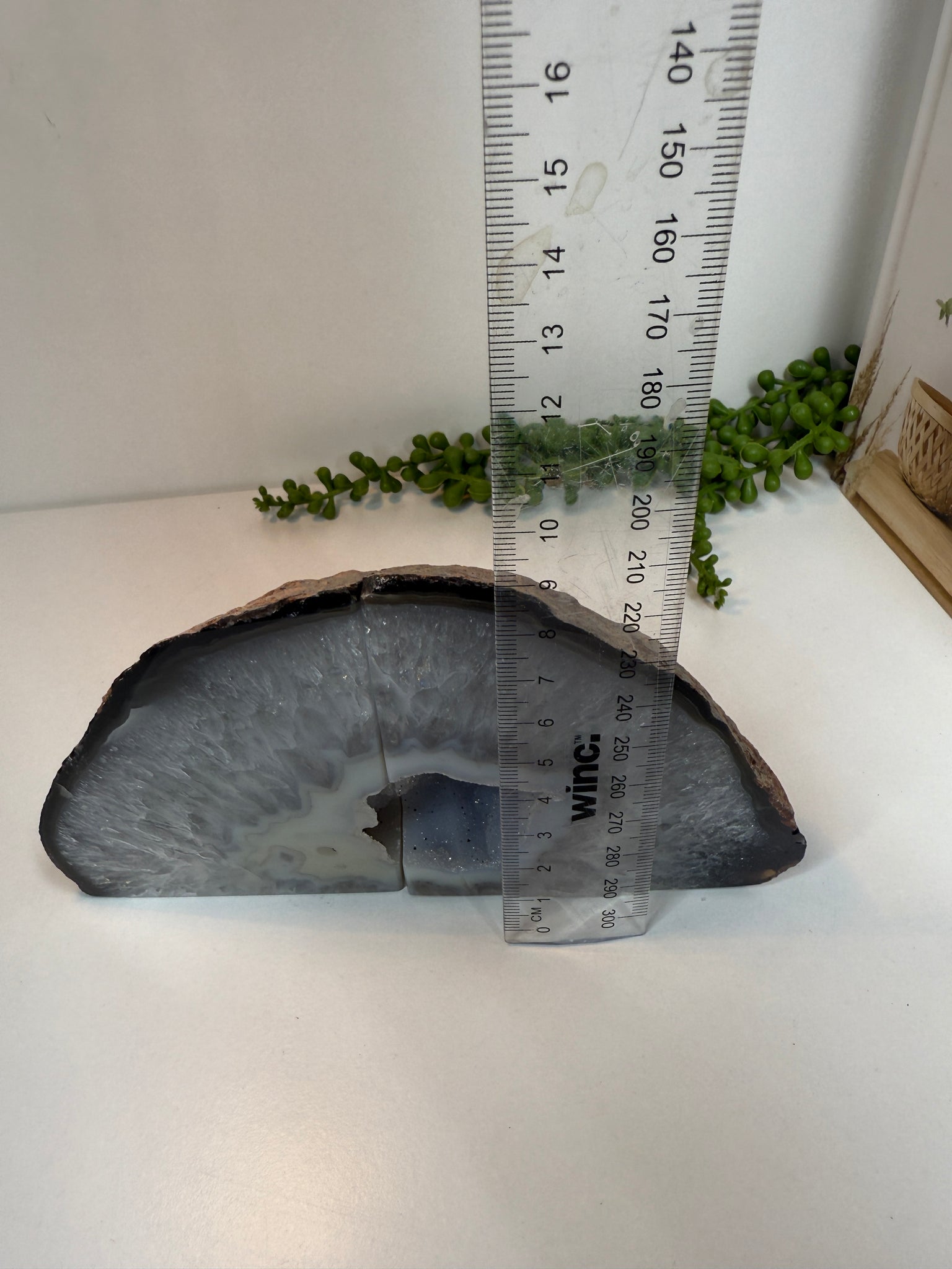 Polished Natural Agate book ends. These book ends are a natural stone, cut in half, and then polished to reveal naturally occurring patterned rings, geodes and crystals inside. These bookends are truly unique as they can be used in different directions (see photographs where it changes the look).