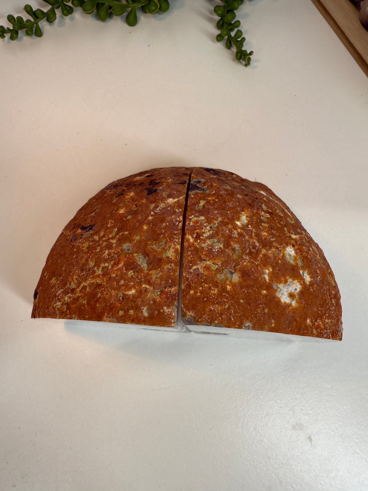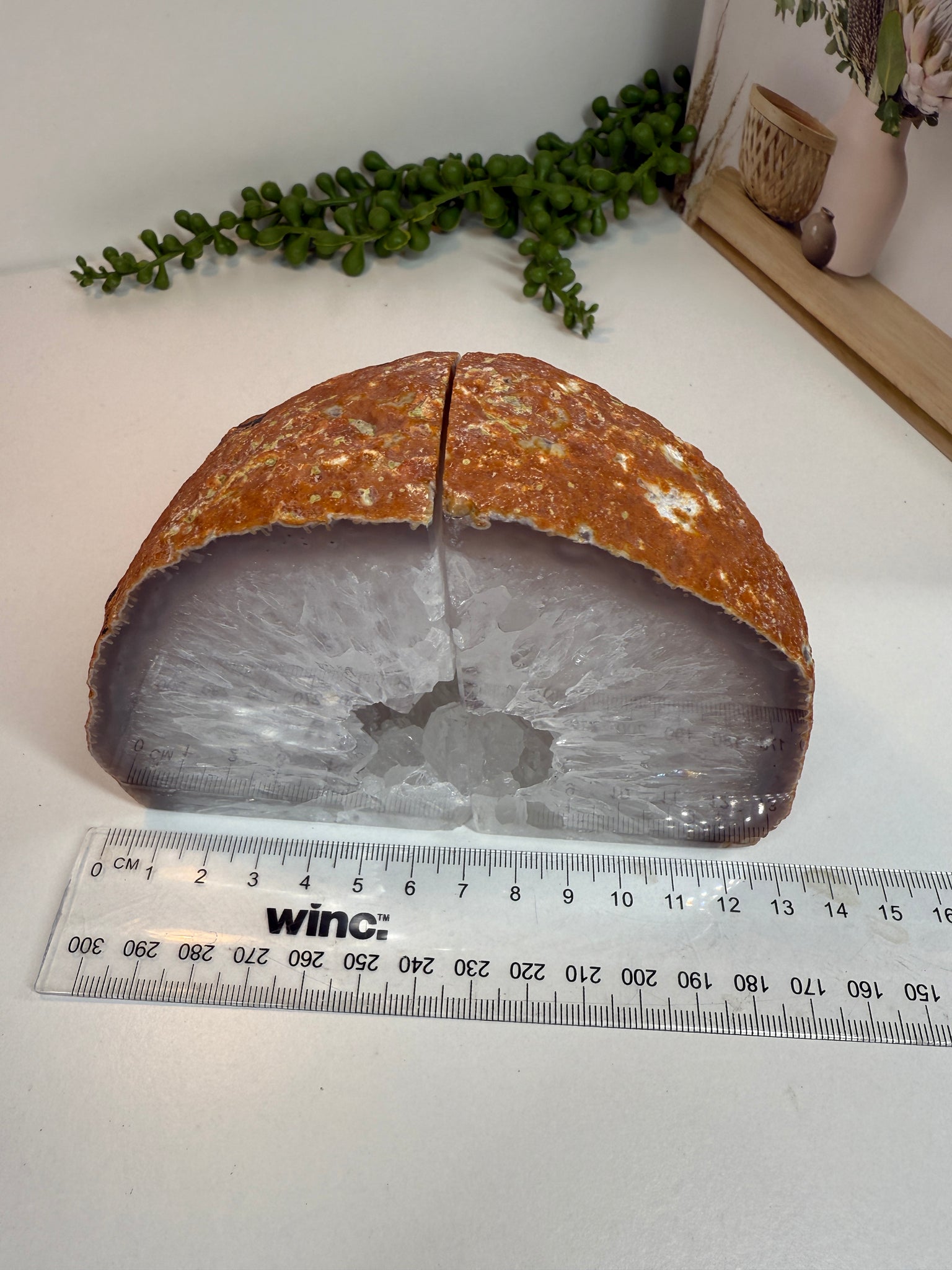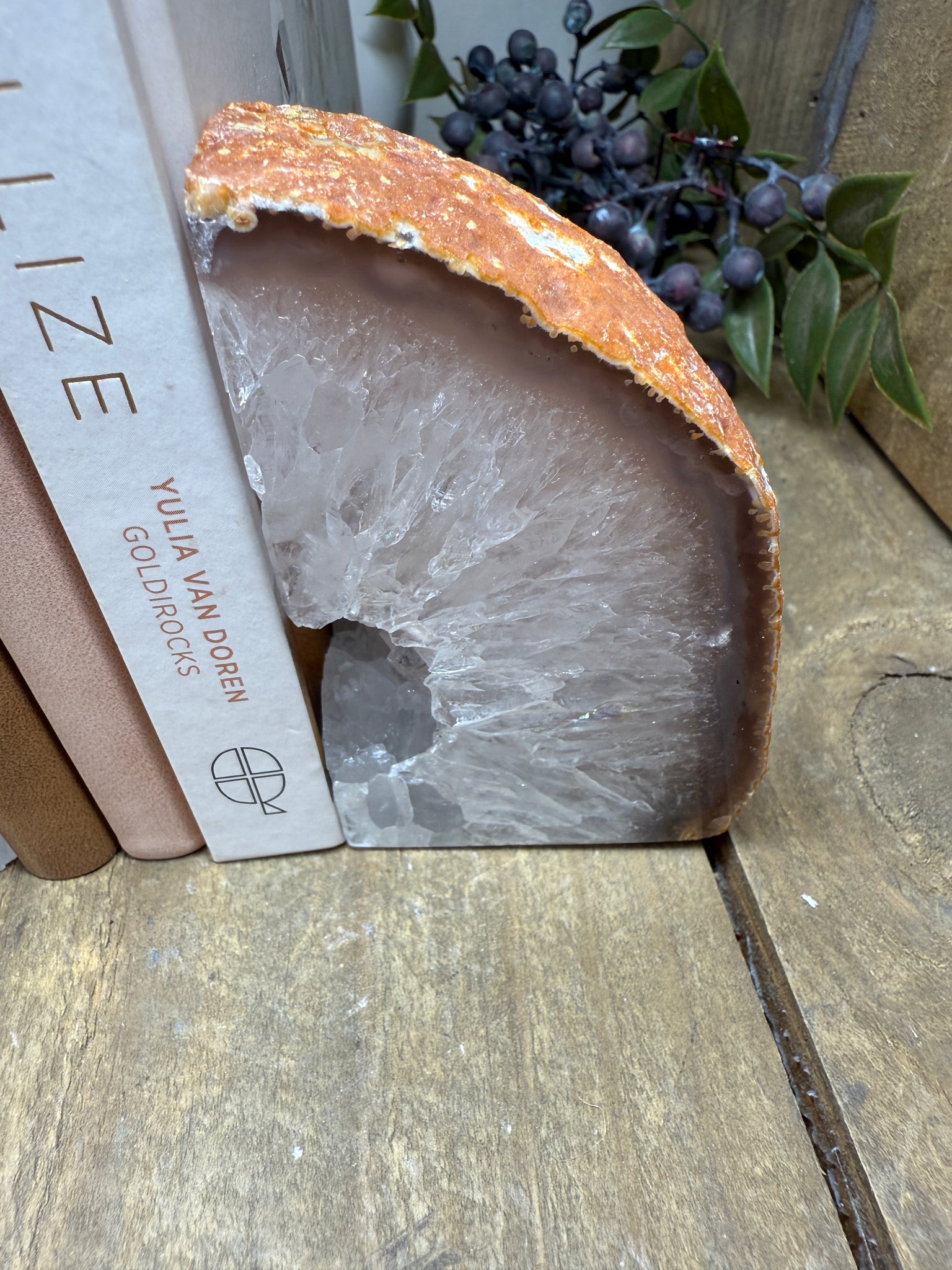 Polished Natural Agate book ends. These book ends are a natural stone, cut in half, and then polished to reveal naturally occurring patterned rings, geodes and crystals inside. These bookends are truly unique as they can be used in different directions (see photographs where it changes the look).
