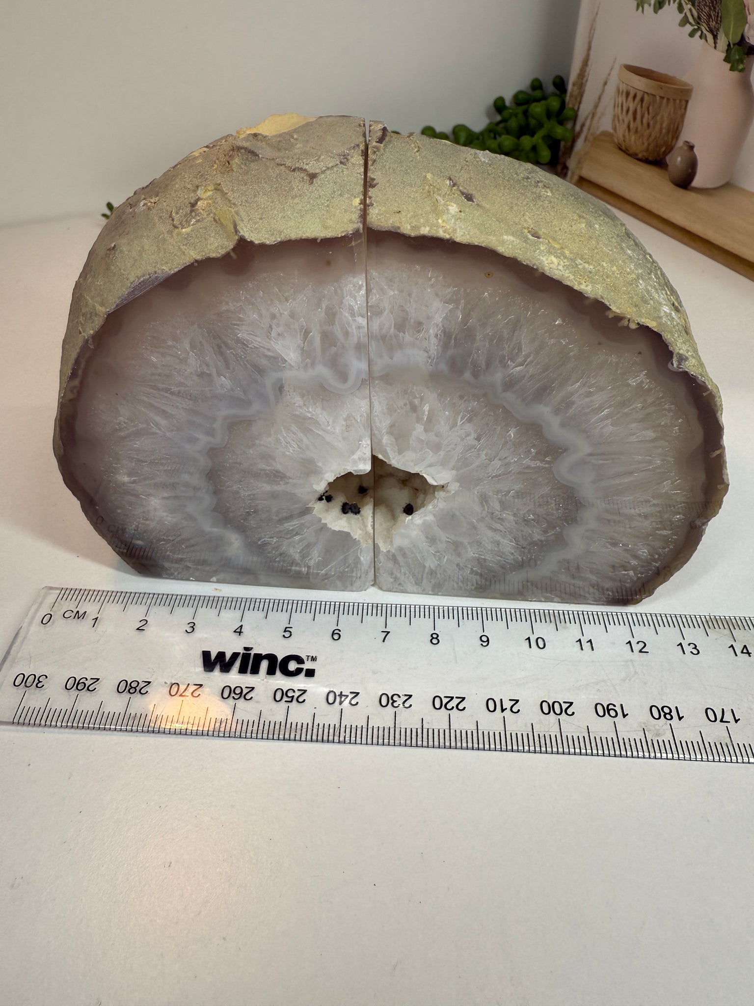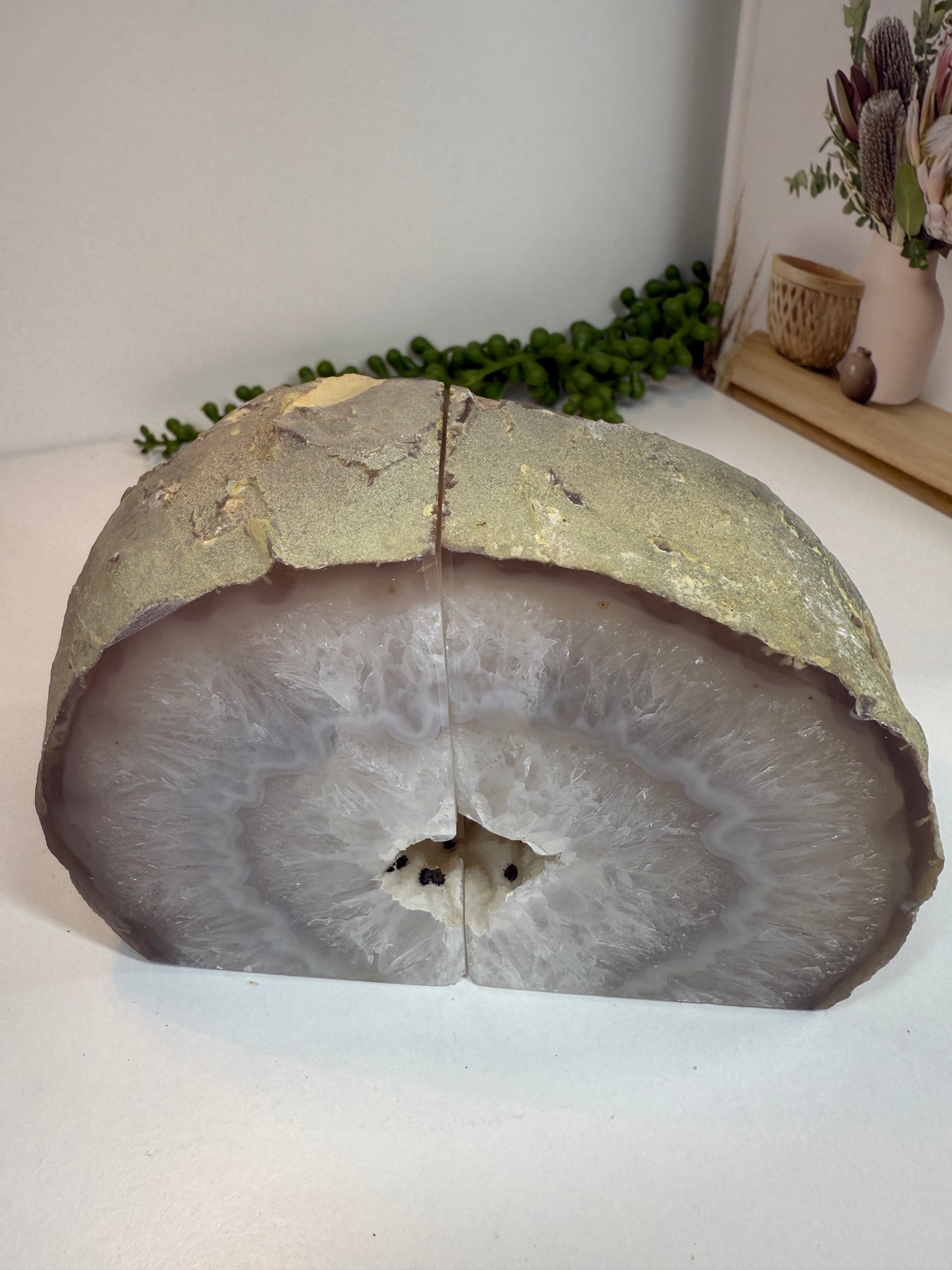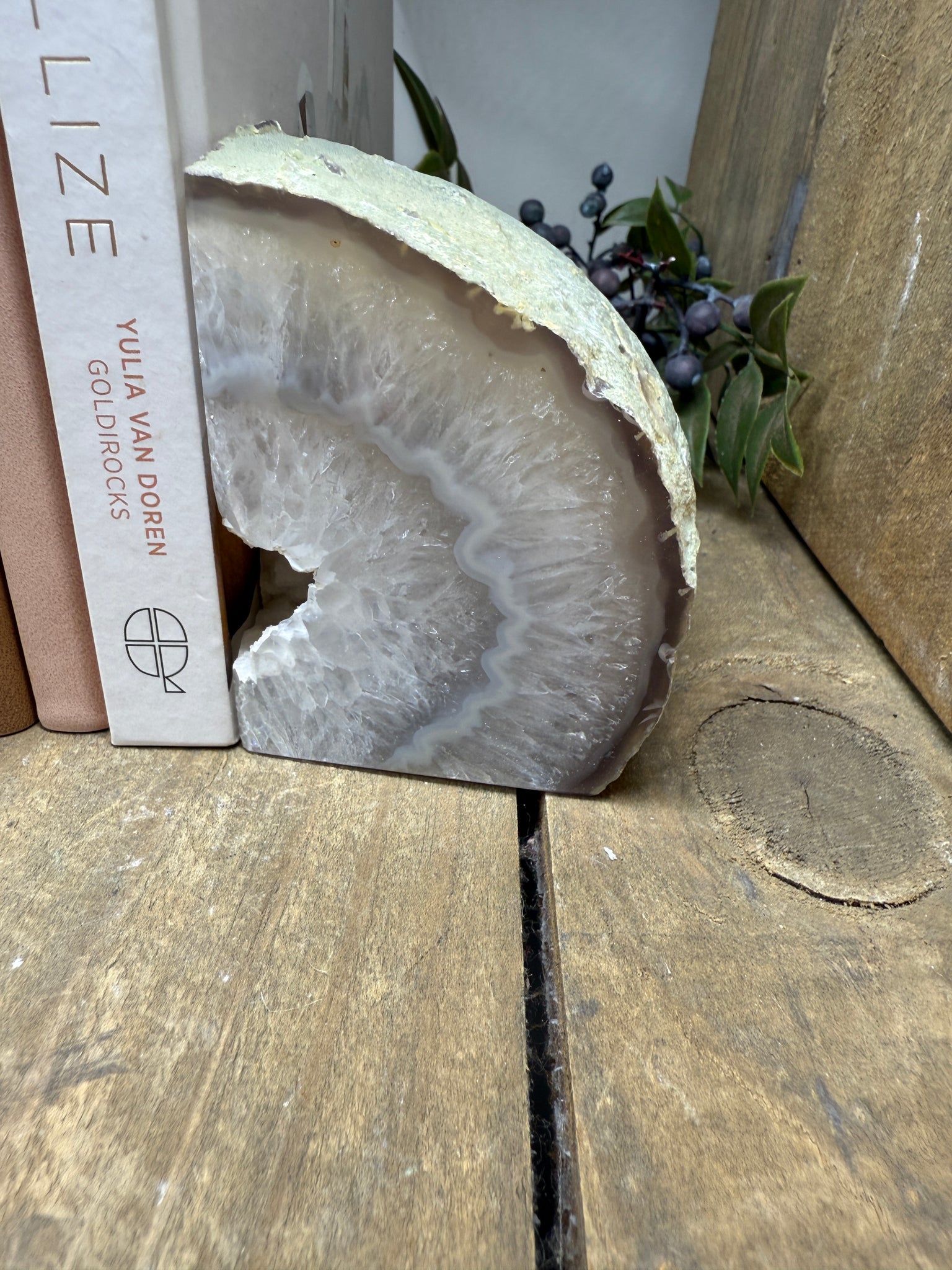 Polished Natural Agate book ends. These book ends are a natural stone, cut in half, and then polished to reveal naturally occurring patterned rings, geodes and crystals inside. These bookends are truly unique as they can be used in different directions (see photographs where it changes the look).