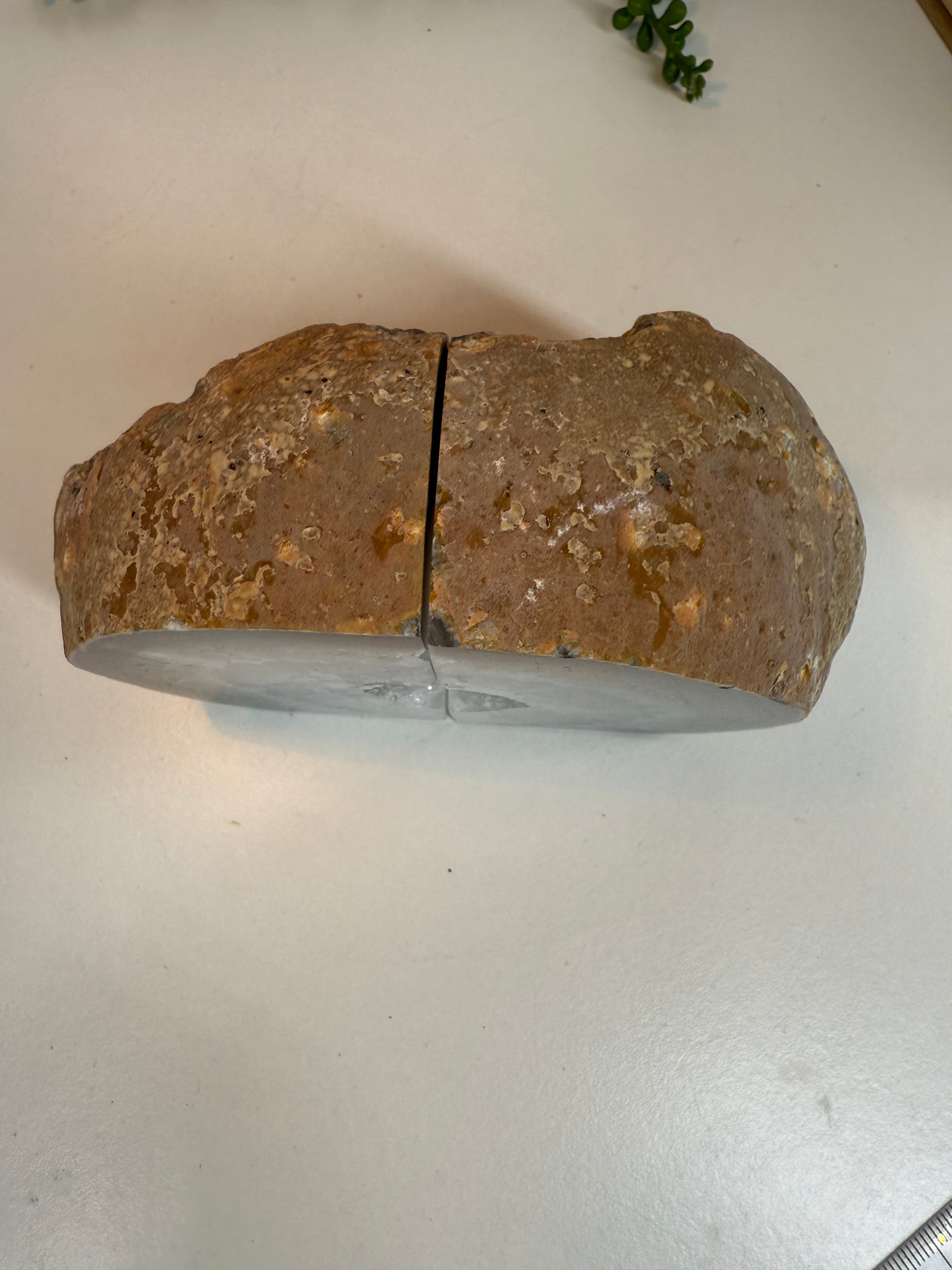 Polished Natural Agate book ends. These book ends are a natural stone, cut in half, and then polished to reveal naturally occurring patterned rings, geodes and crystals inside. These bookends are truly unique as they can be used in different directions (see photographs where it changes the look).