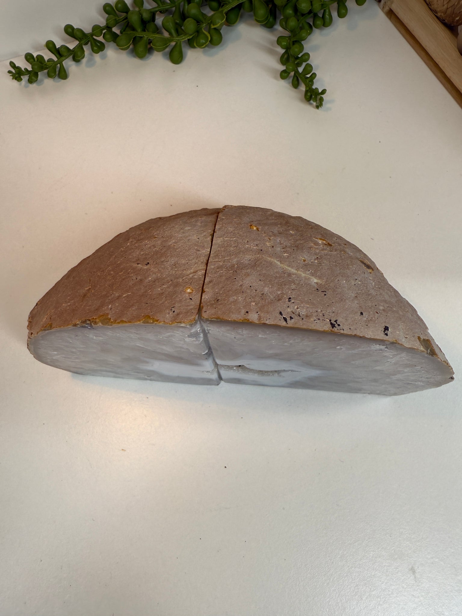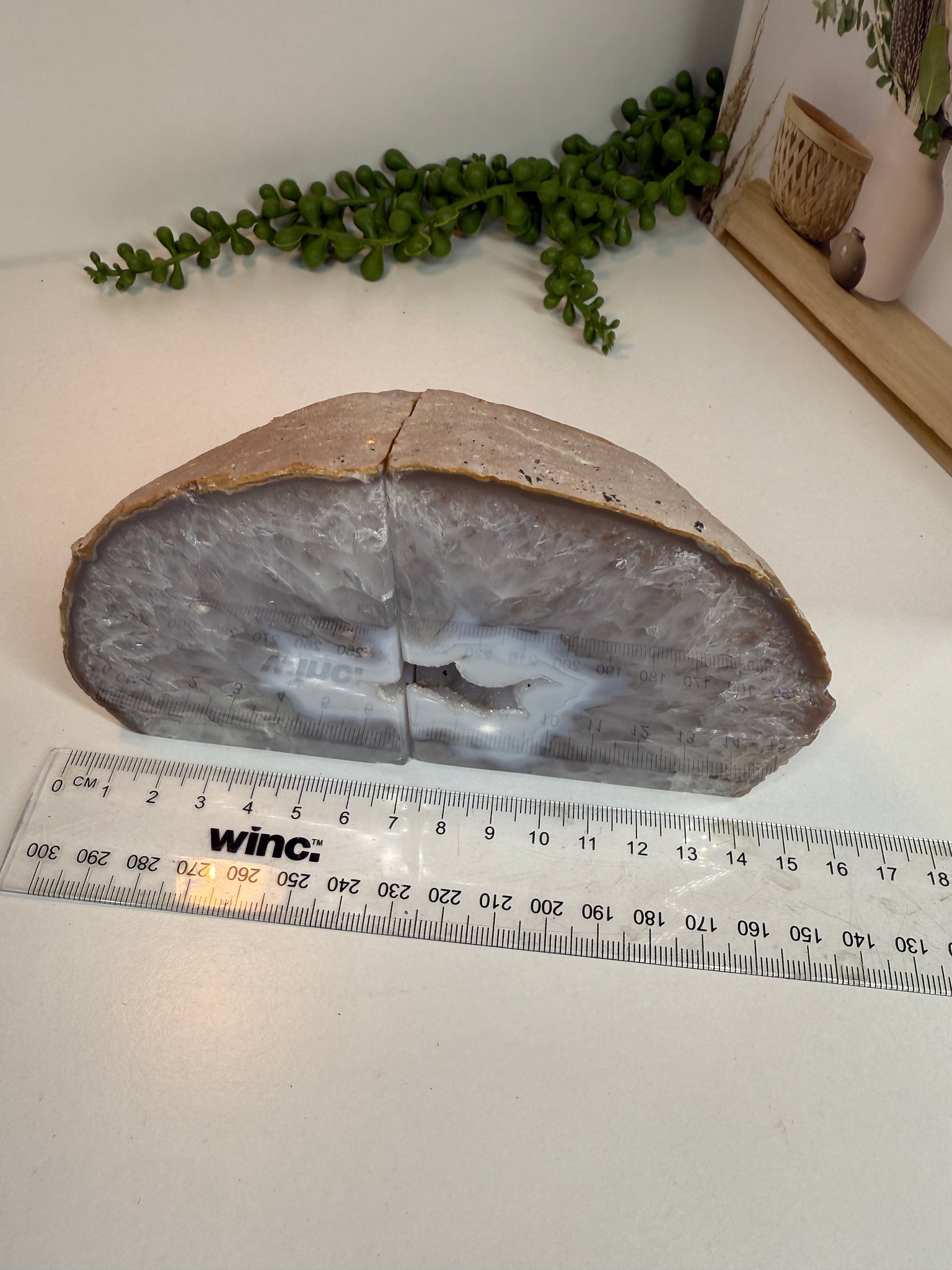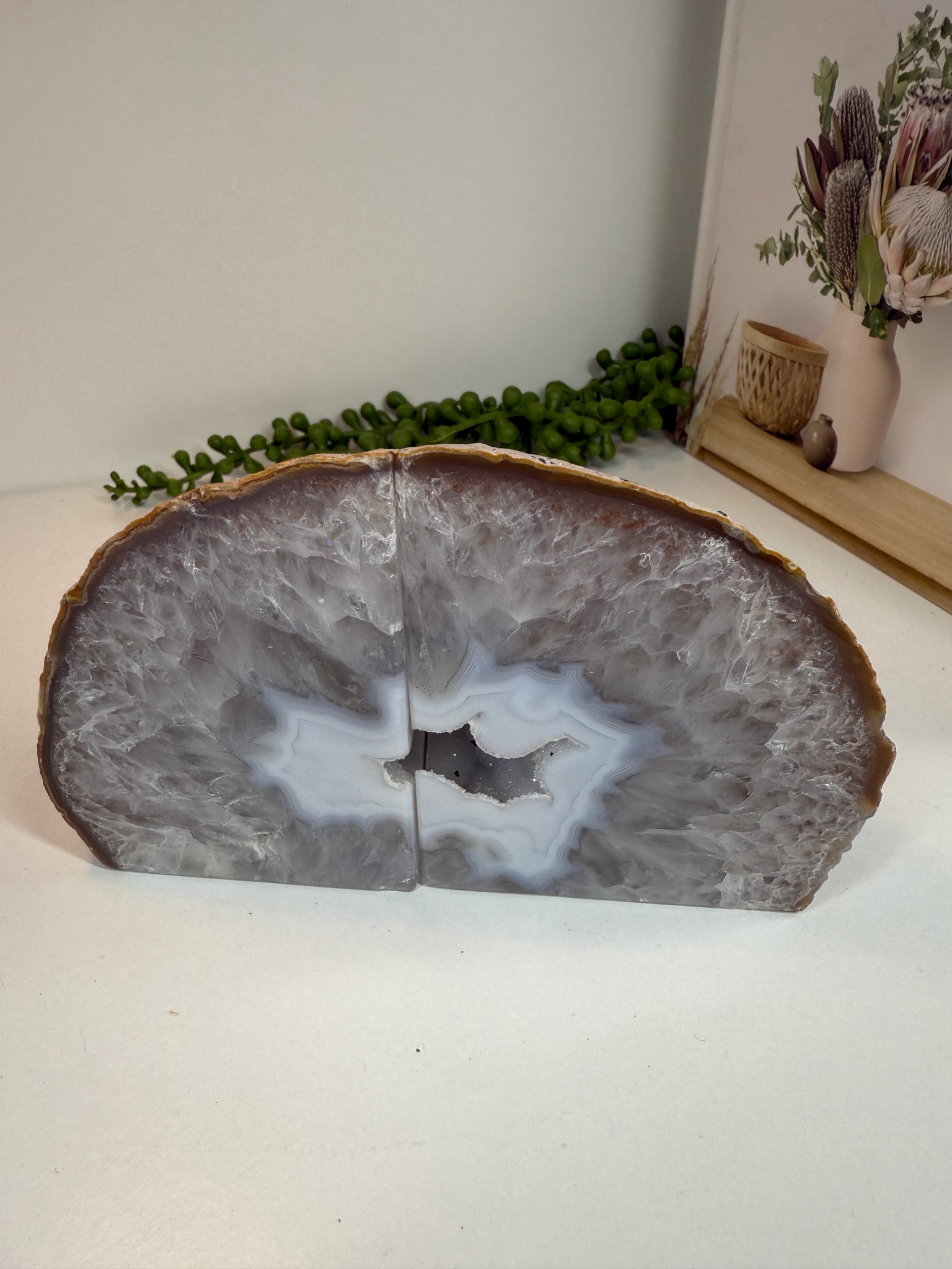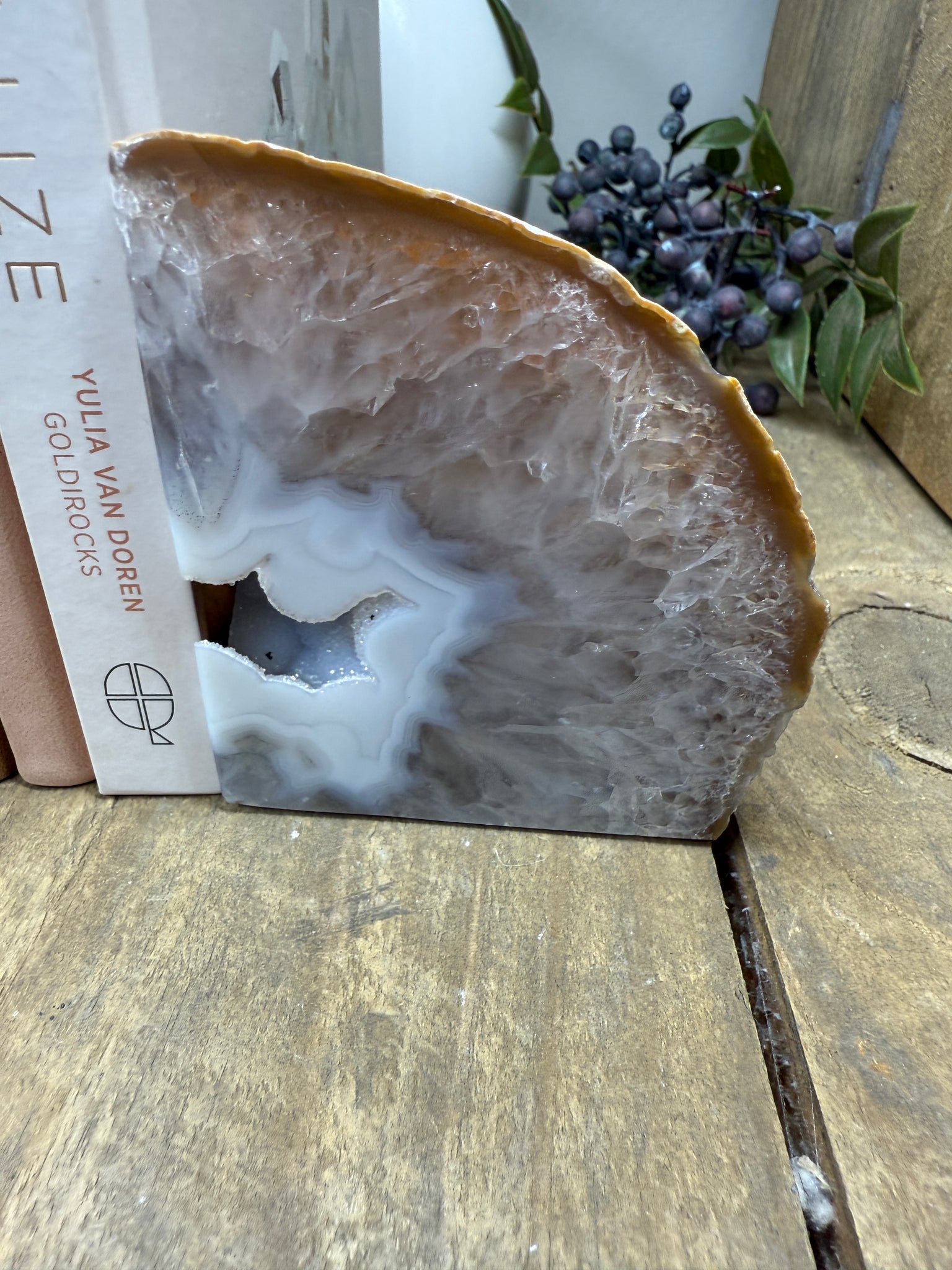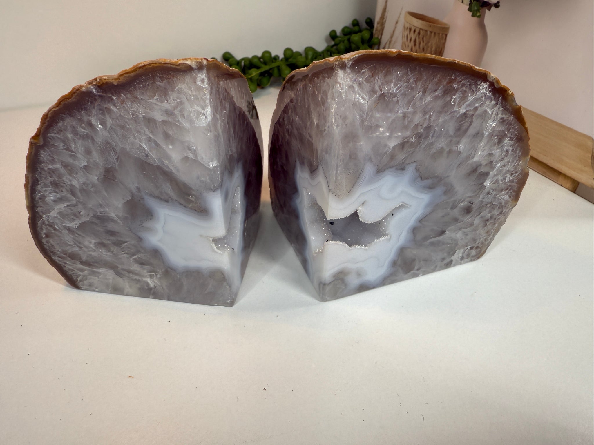 Polished Natural Agate book ends. These book ends are a natural stone, cut in half, and then polished to reveal naturally occurring patterned rings, geodes and crystals inside. These bookends are truly unique as they can be used in different directions (see photographs where it changes the look).
