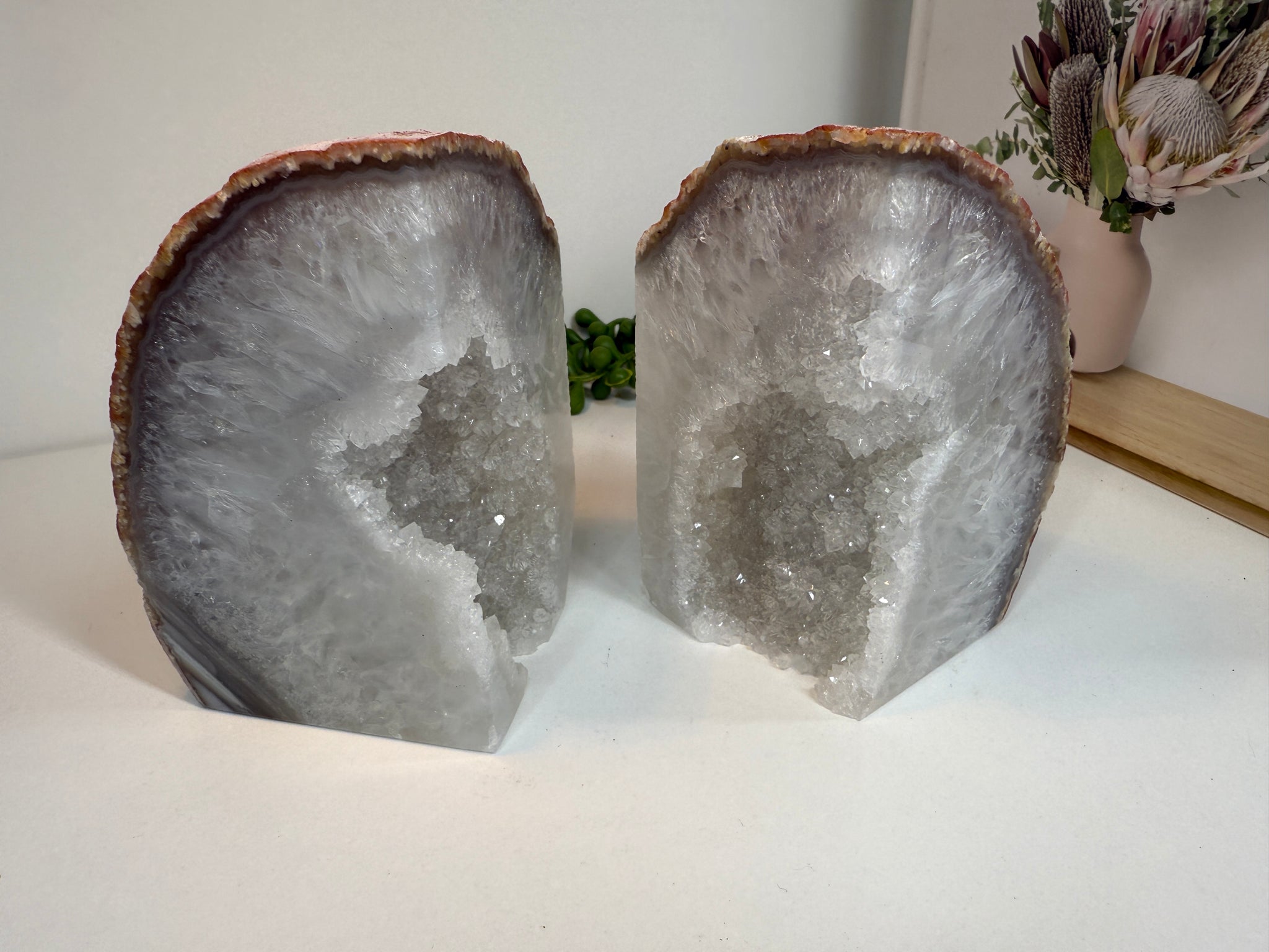 Polished Natural Agate book ends. These book ends are a natural stone, cut in half, and then polished to reveal naturally occurring patterned rings, geodes and crystals inside. These bookends are truly unique as they can be used in different directions (see photographs where it changes the look).