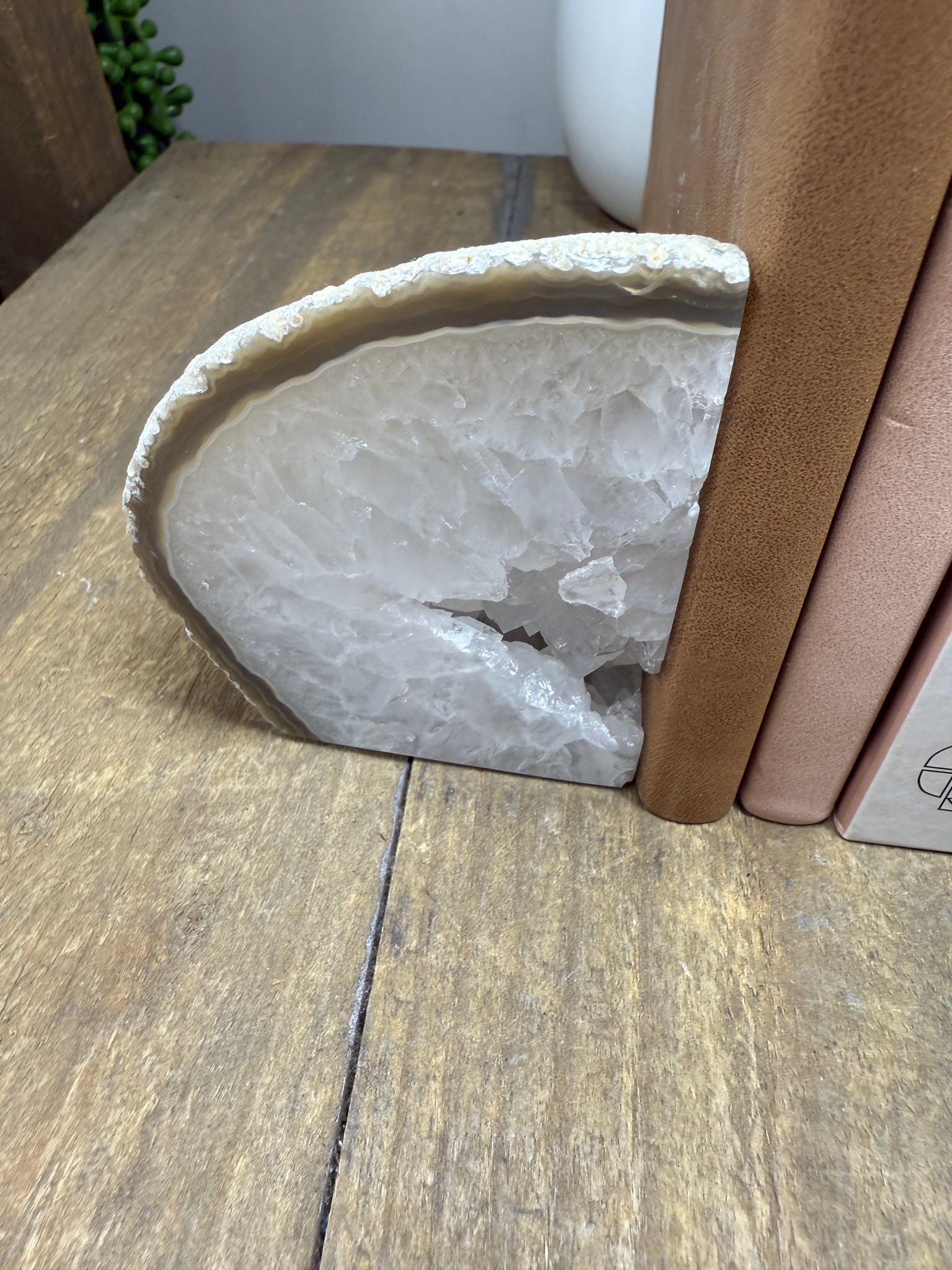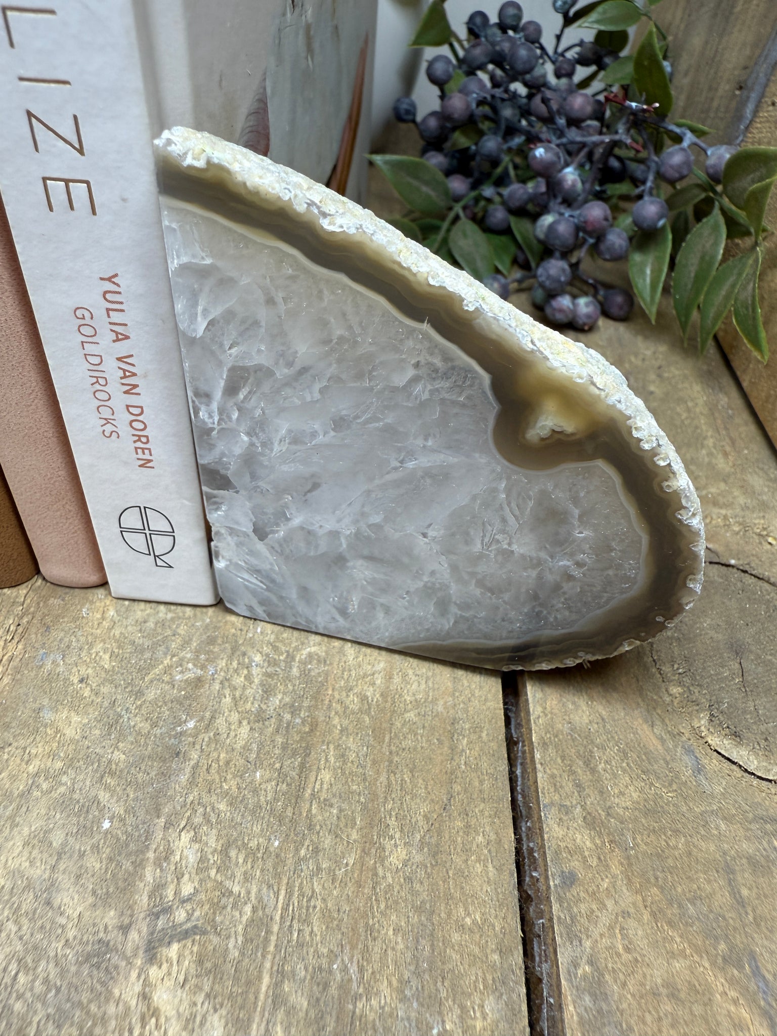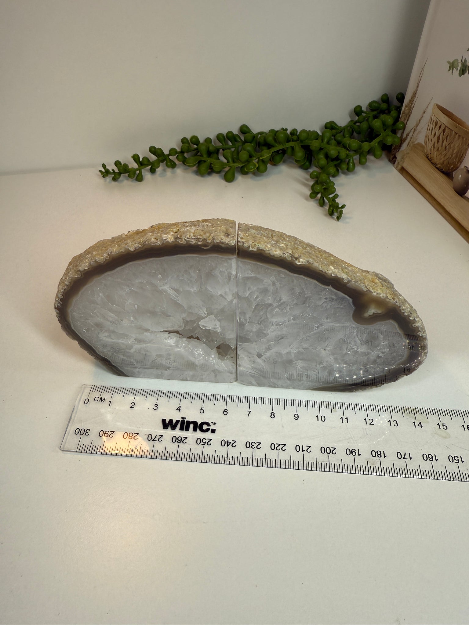 Polished Natural Agate book ends. These book ends are a natural stone, cut in half, and then polished to reveal naturally occurring patterned rings, geodes and crystals inside. These bookends are truly unique as they can be used in different directions (see photographs where it changes the look).