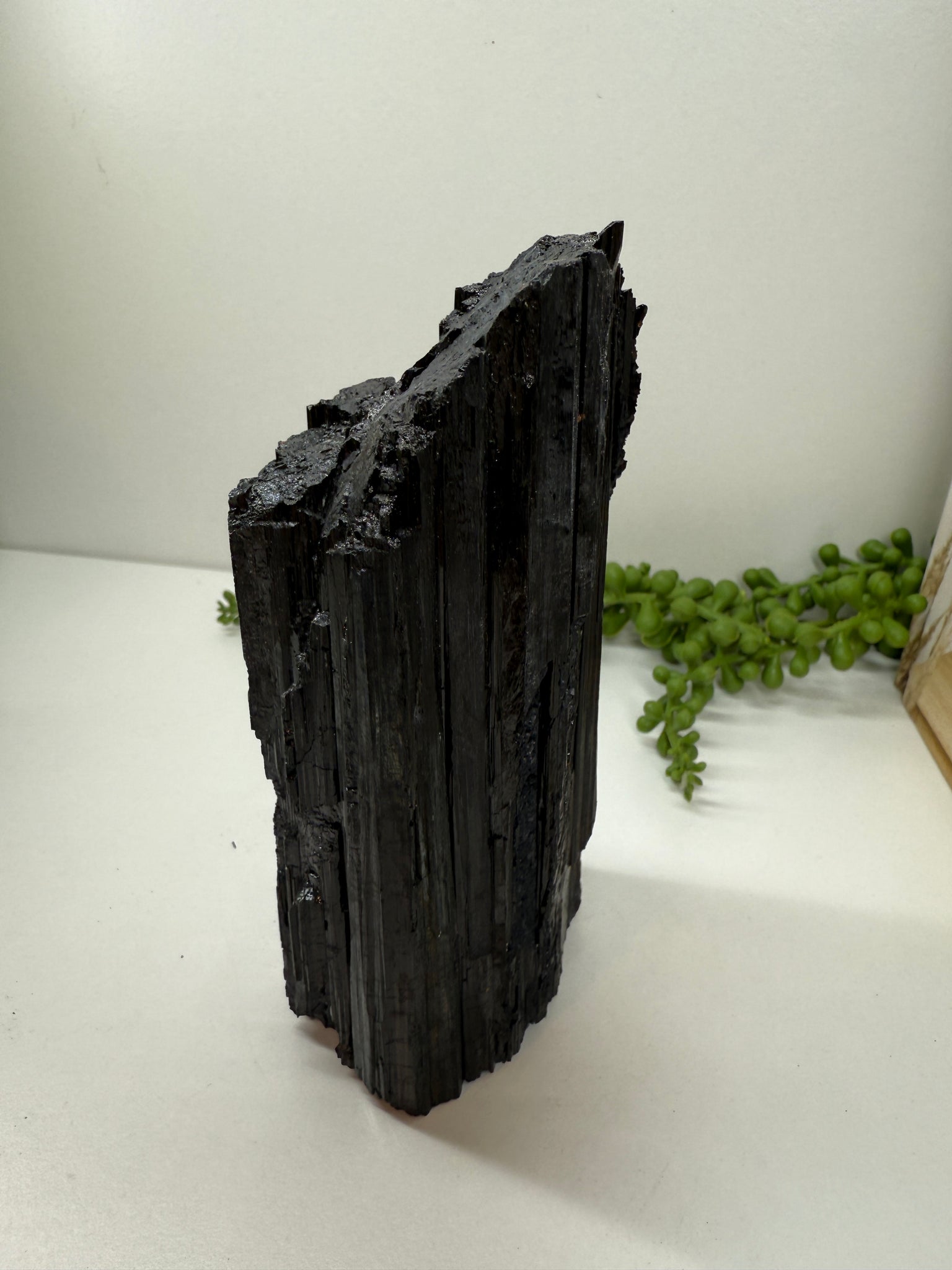 Raw and natural Black Tourmaline. High quality with a generous natural shine to each piece. This is a natural stone that has been cut on the bottom to ensure a flat base for easy display. There are often flecks of other natural crystals such as quartz and pyrite found in these pieces.