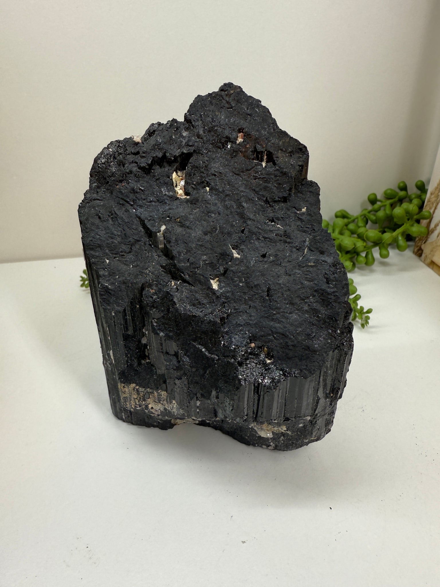 Raw and natural Black Tourmaline. High quality with a generous natural shine to each piece. This is a natural stone that has been cut on the bottom to ensure a flat base for easy display. There are often flecks of other natural crystals such as quartz and pyrite found in these pieces.