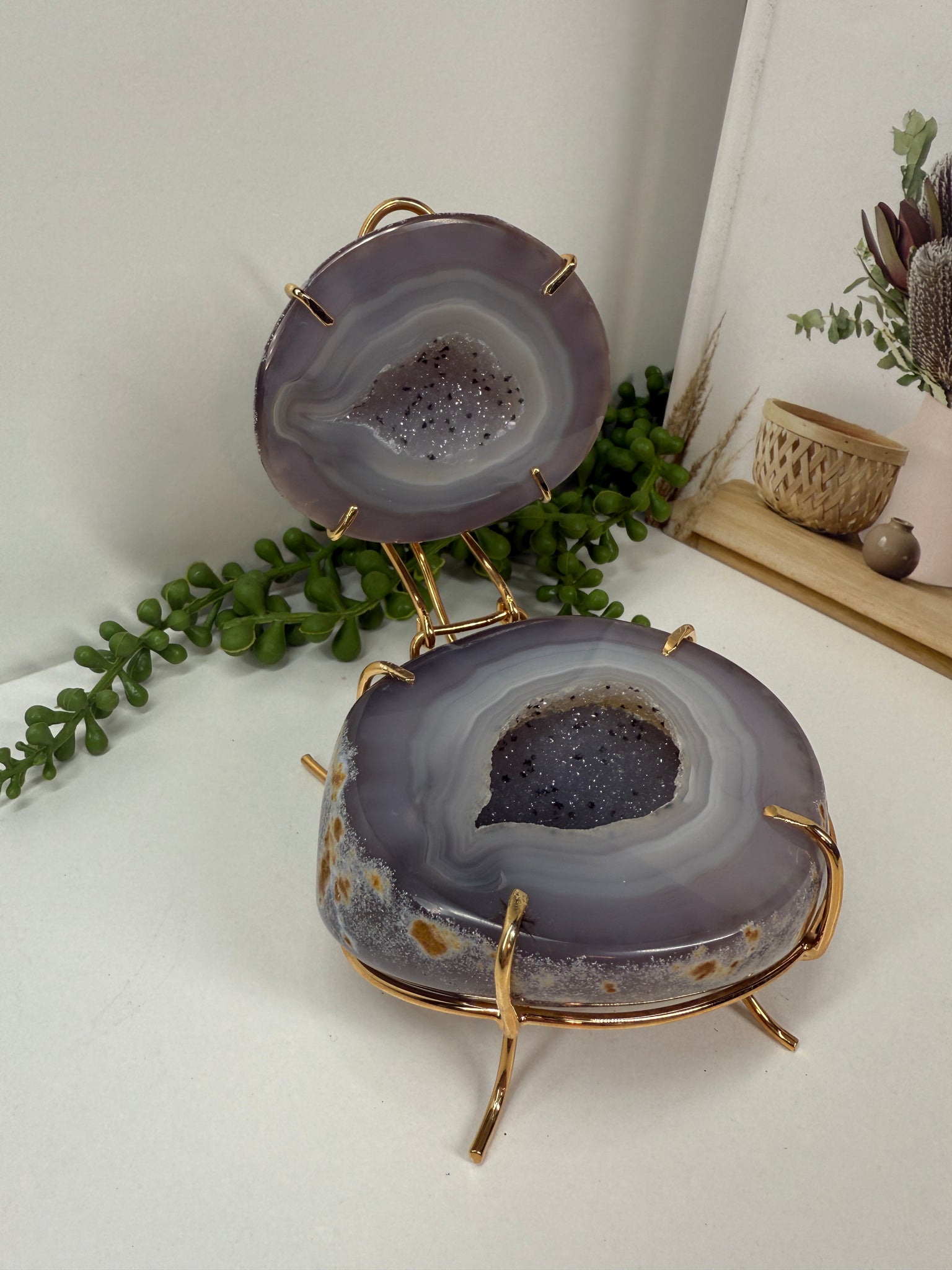 This item will perfectly compliment any living room, office or bedroom. The Agate Geodes have been hand selected to ensure nice colouring and stunning crystals in the middle. The Geode has been cut in half and then set in a gold wire metal base.