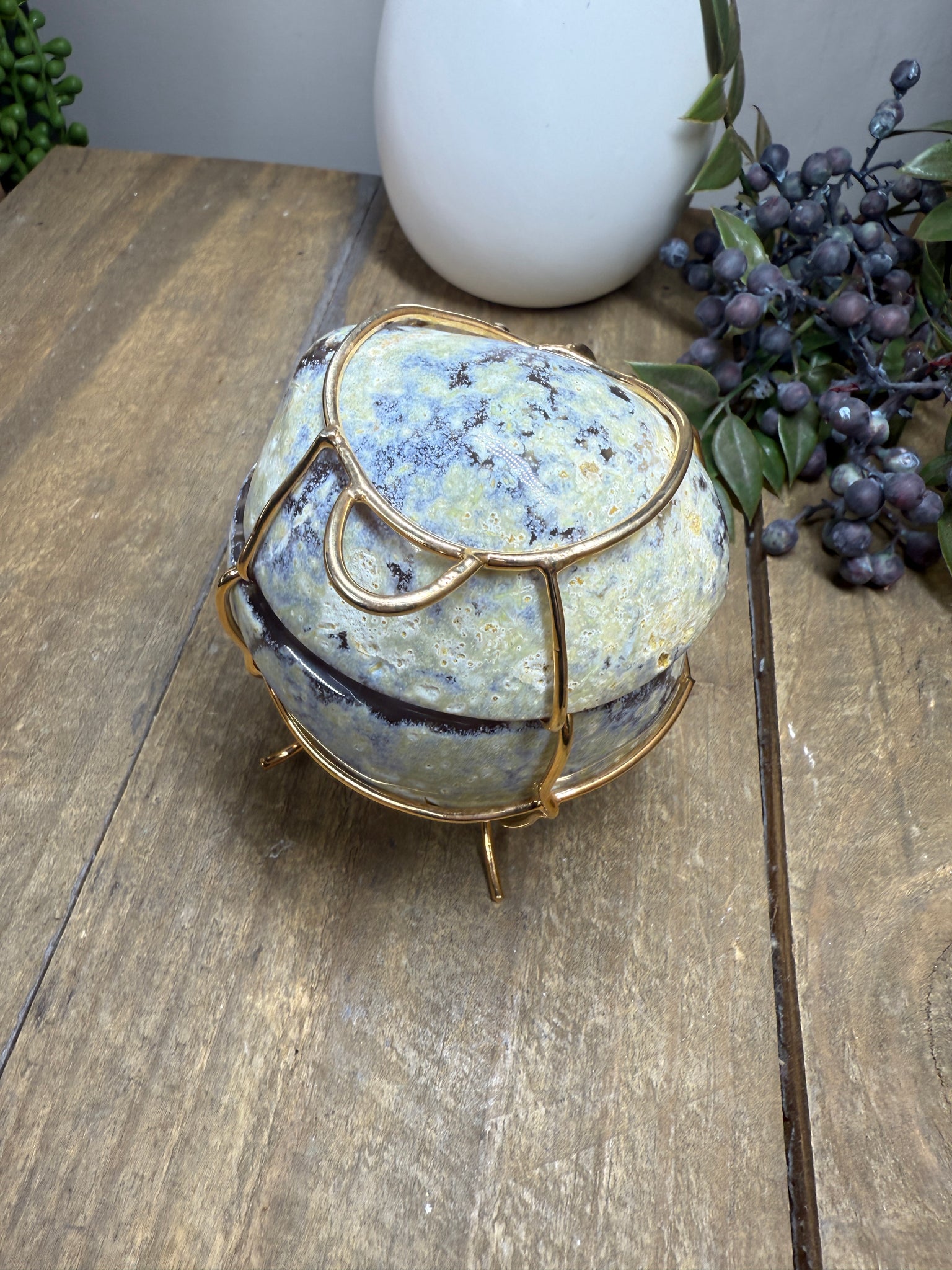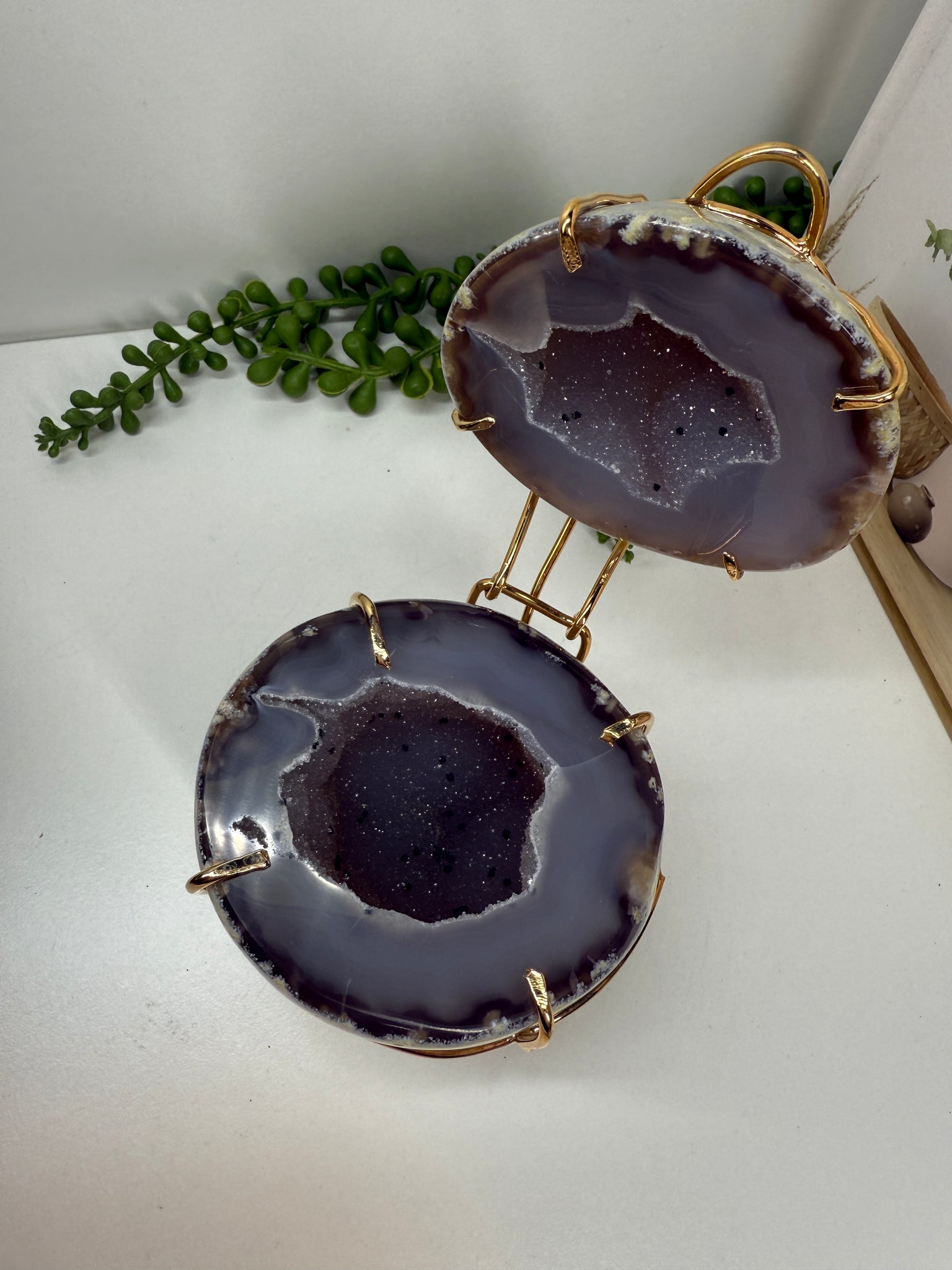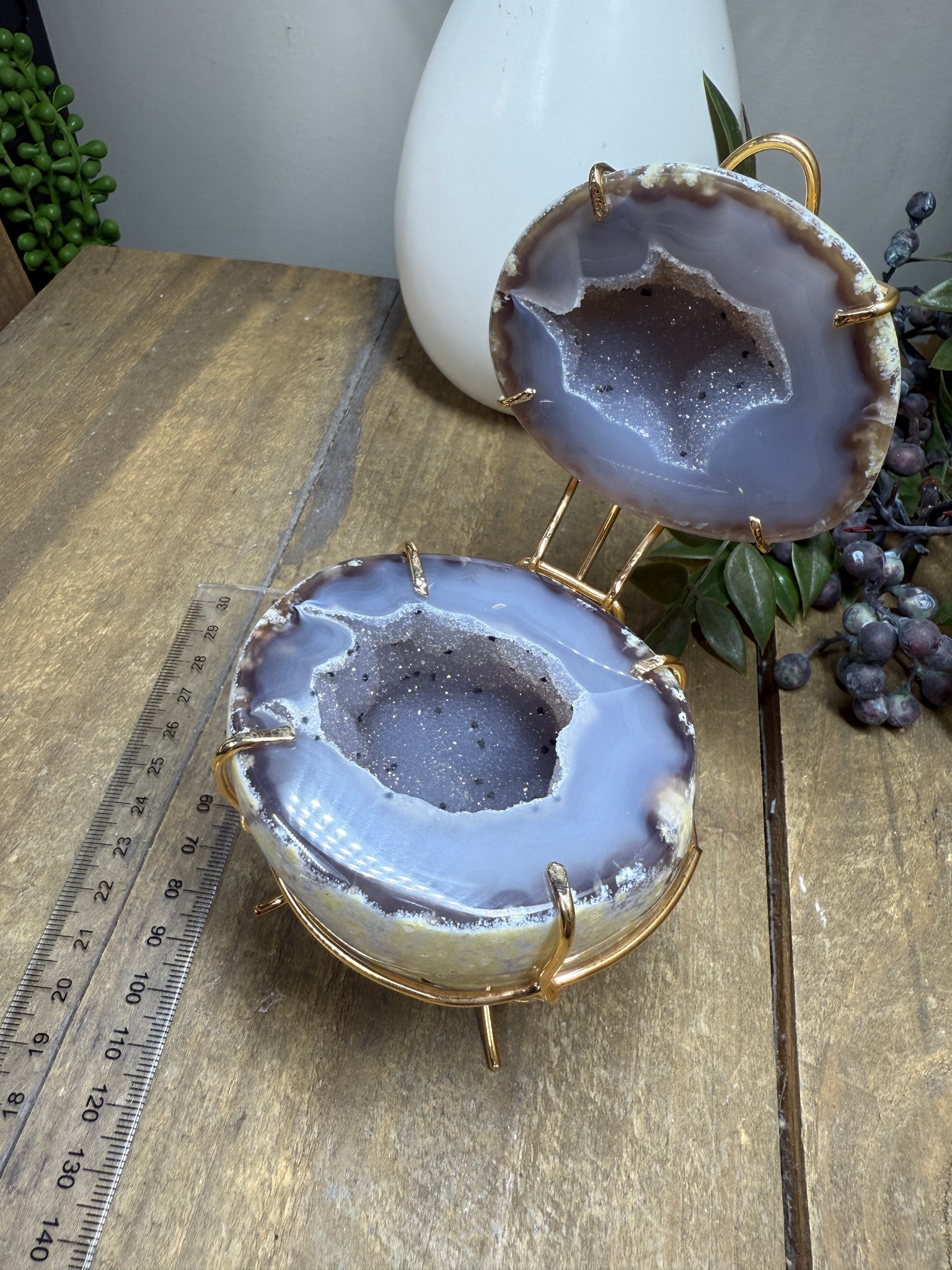 This item will perfectly compliment any living room, office or bedroom. The Agate Geodes have been hand selected to ensure nice colouring and stunning crystals in the middle. The Geode has been cut in half and then set in a gold wire metal base.