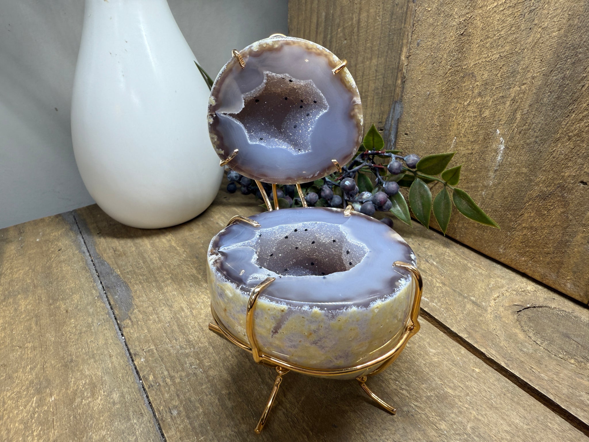 Natural Agate Geode box with sparkling crystals in the middle. AA quality. This Agate is a natural stone, cut in half and then slightly polished around the top edges to reveal naturally occurring patterned rings. Complimented with its natural sparkling crystals inside. Hand made and set up as a small trinket box, jewelry box or display piece.