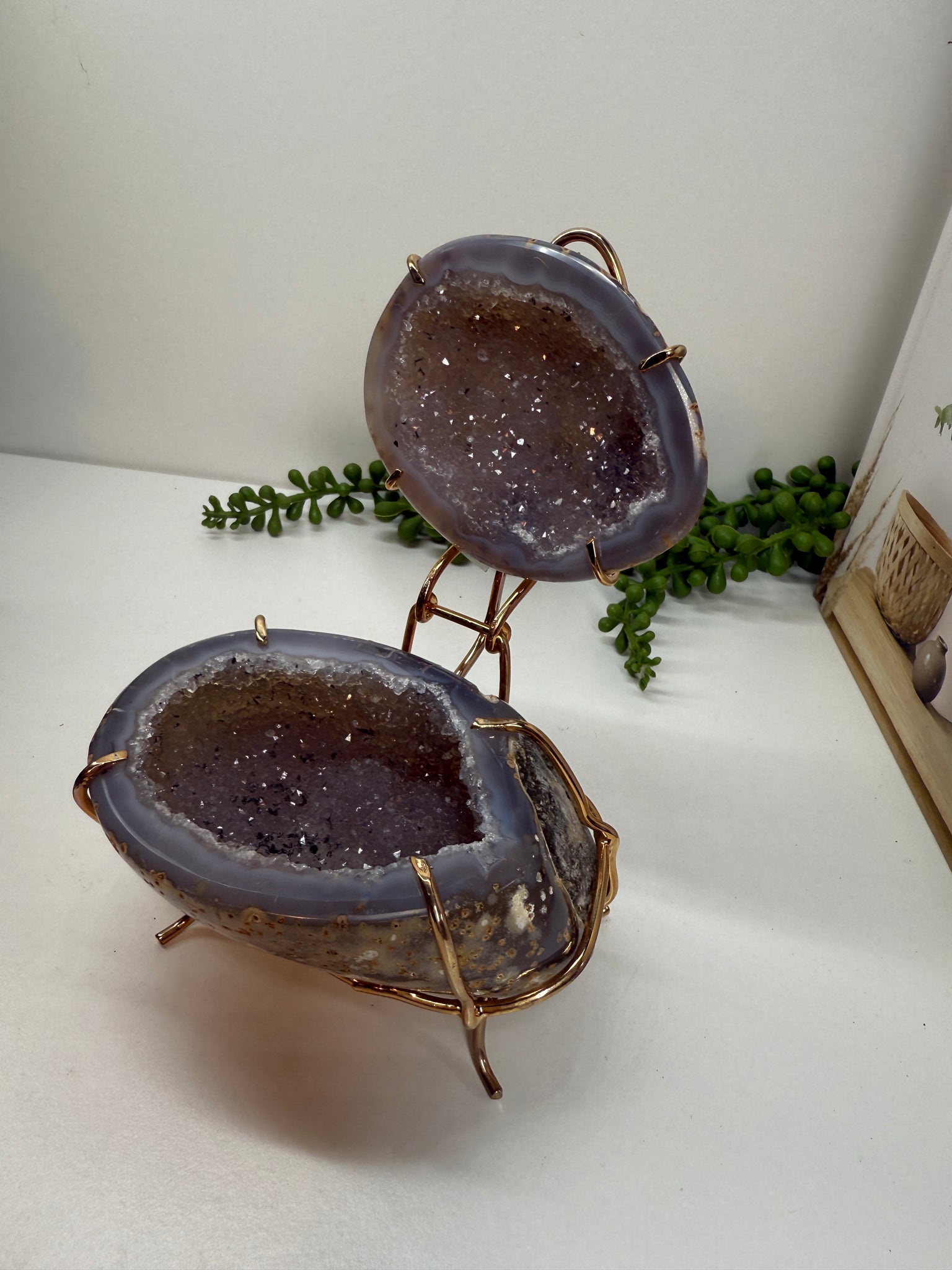 This item will perfectly compliment any living room, office or bedroom. The Agate Geodes have been hand selected to ensure nice colouring and stunning crystals in the middle. The Geode has been cut in half and then set in a gold wire metal base.
