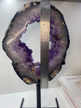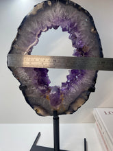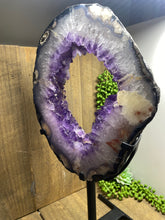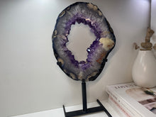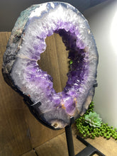 Natural Amethyst geode slice on removable stand. This Amethyst is from Brazil and is in its natural state with beautiful naturally formed crystals. It has been carefully cut, polished and placed on a custom made stand. The stand turns 360 degrees and carefully fits around the stone. The Amethyst can be removed from the stand.