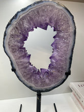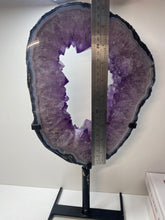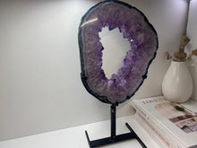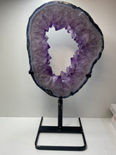 Natural Amethyst geode slice on removable stand. This Amethyst is from Brazil and is in its natural state with beautiful naturally formed crystals. It has been carefully cut, polished and placed on a custom made stand. The stand turns 360 degrees and carefully fits around the stone. The Amethyst can be removed from the stand.