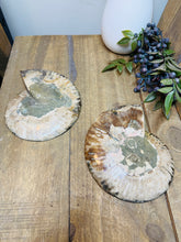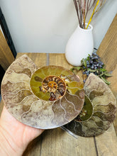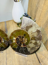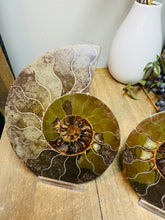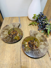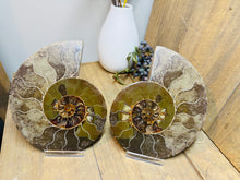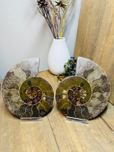 These fossils consist of an Ammonite cut in half and polished to create a gorgeous pair. This matching pair have been cut in half and then polished on one side to reveal it's generous colours, internal caves and patterns.